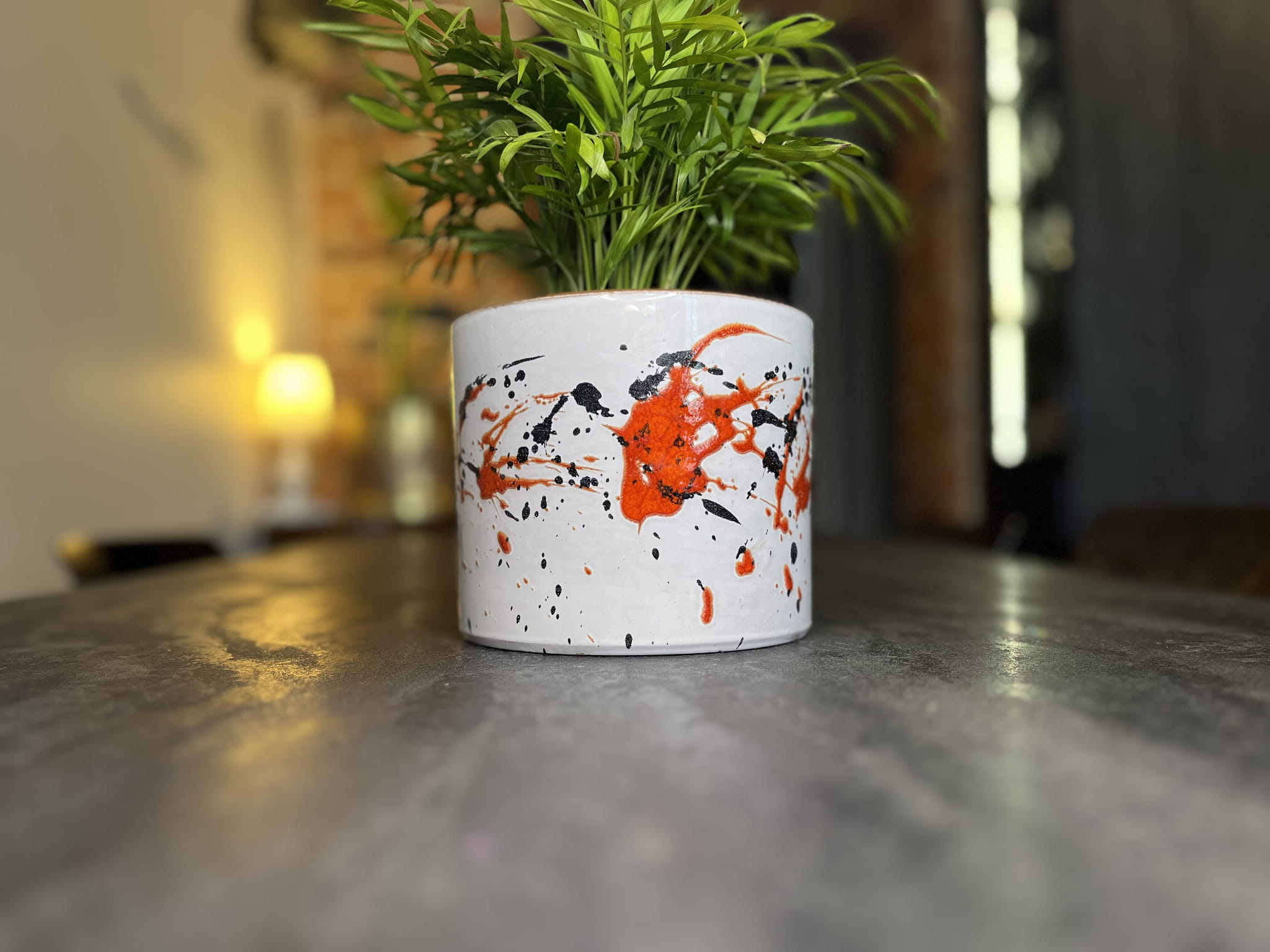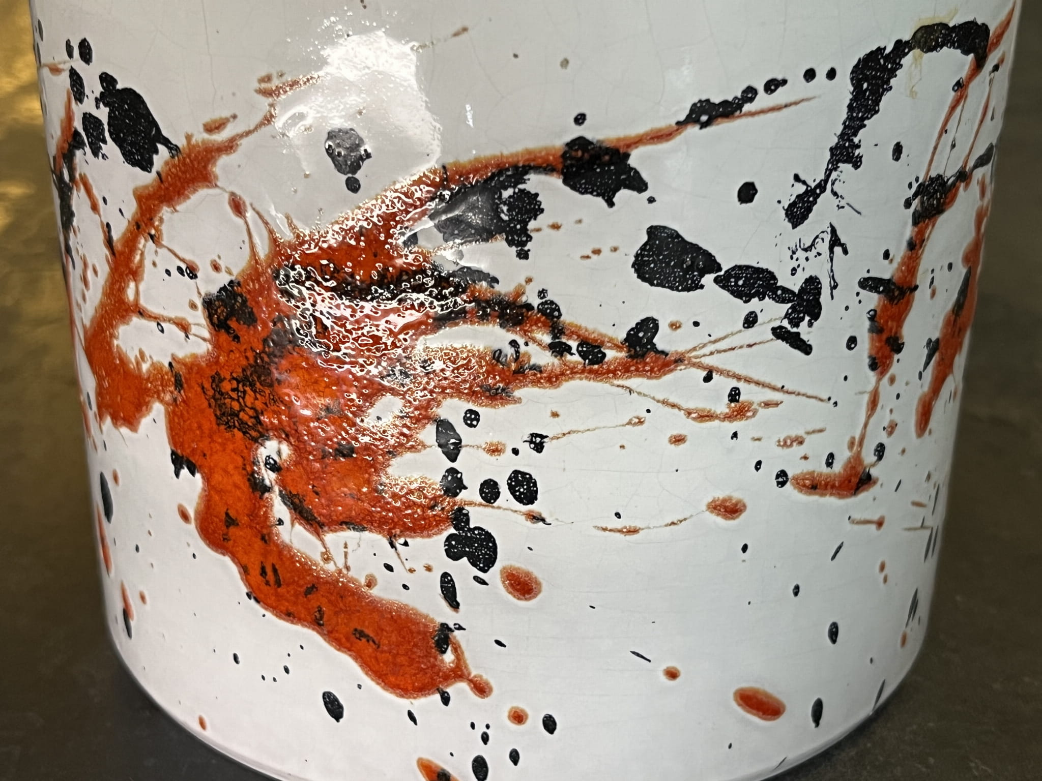 Prosta, cylindryczna forma pokryta jasnym szkliwem stanowi tło dla ekspresyjnego, abstrakcyjnego dekoru w odcieniach czerwieni i czerni. Nieregularne plamy i rozpryski nadają doniczce artystyczny, niemal malarski charakter.