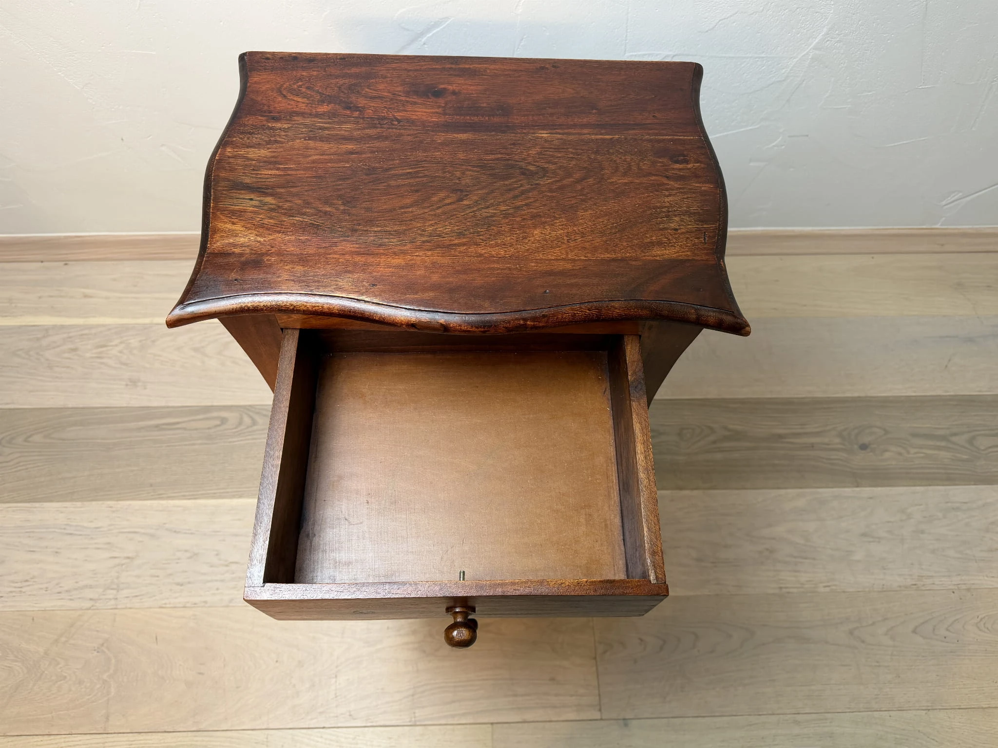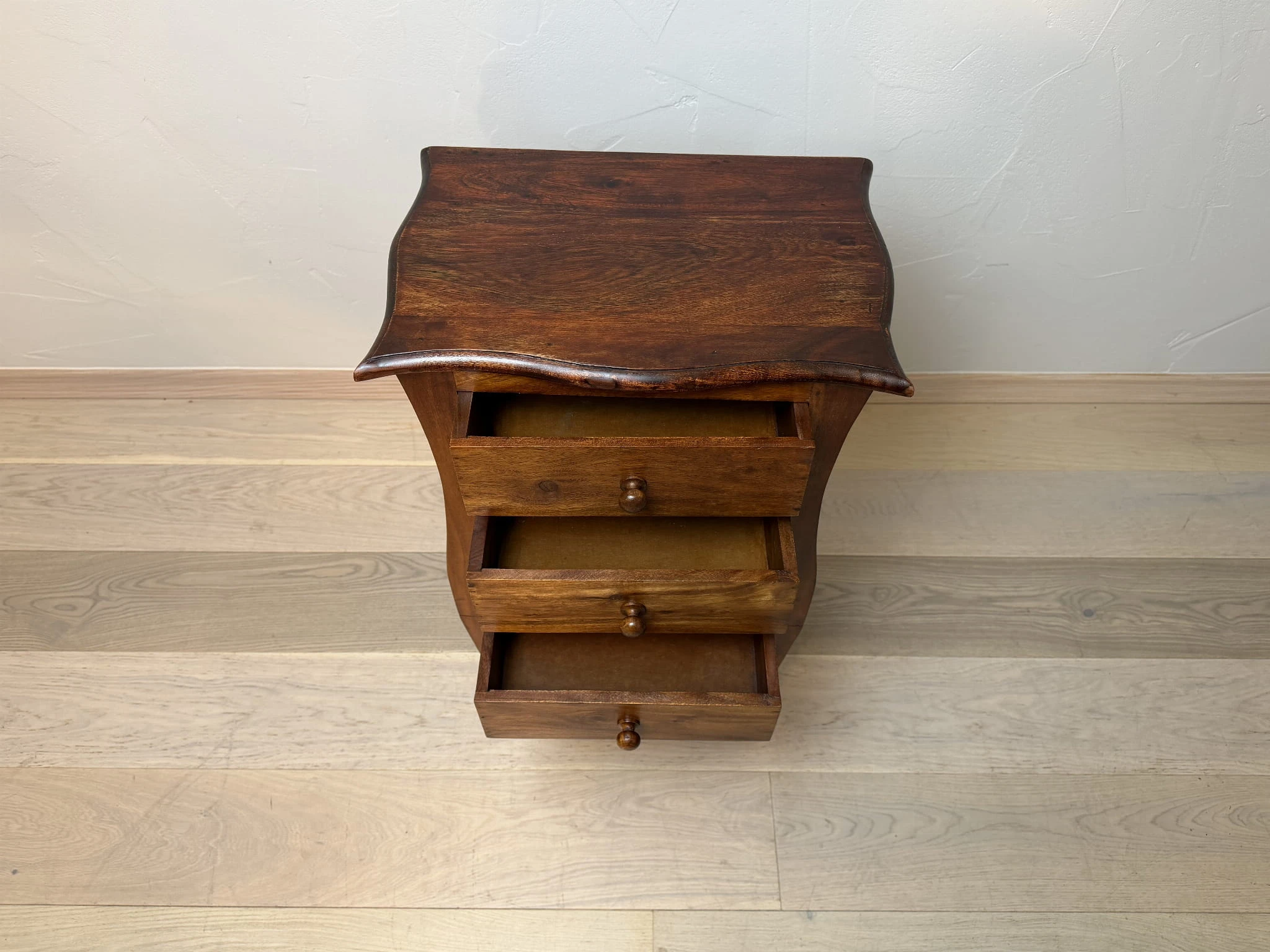 Drewniana komódka z 3 szufladami po renowacji – styl kolonialny