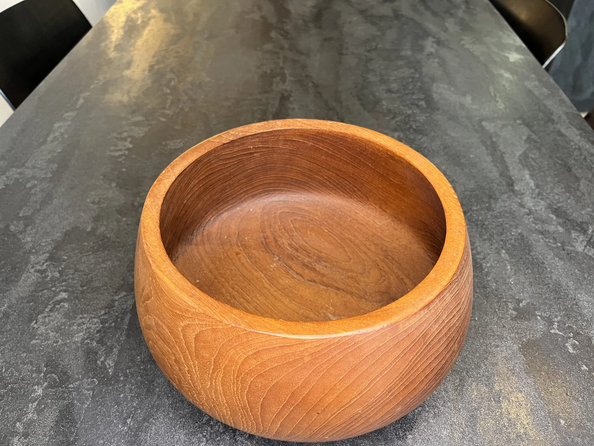 Ręcznie wykonana misa z litego drewna tekowego o naturalnym, ciepłym wybarwieniu. Prosta, zaokrąglona forma podkreśla piękno usłojenia i organiczny charakter materiału.