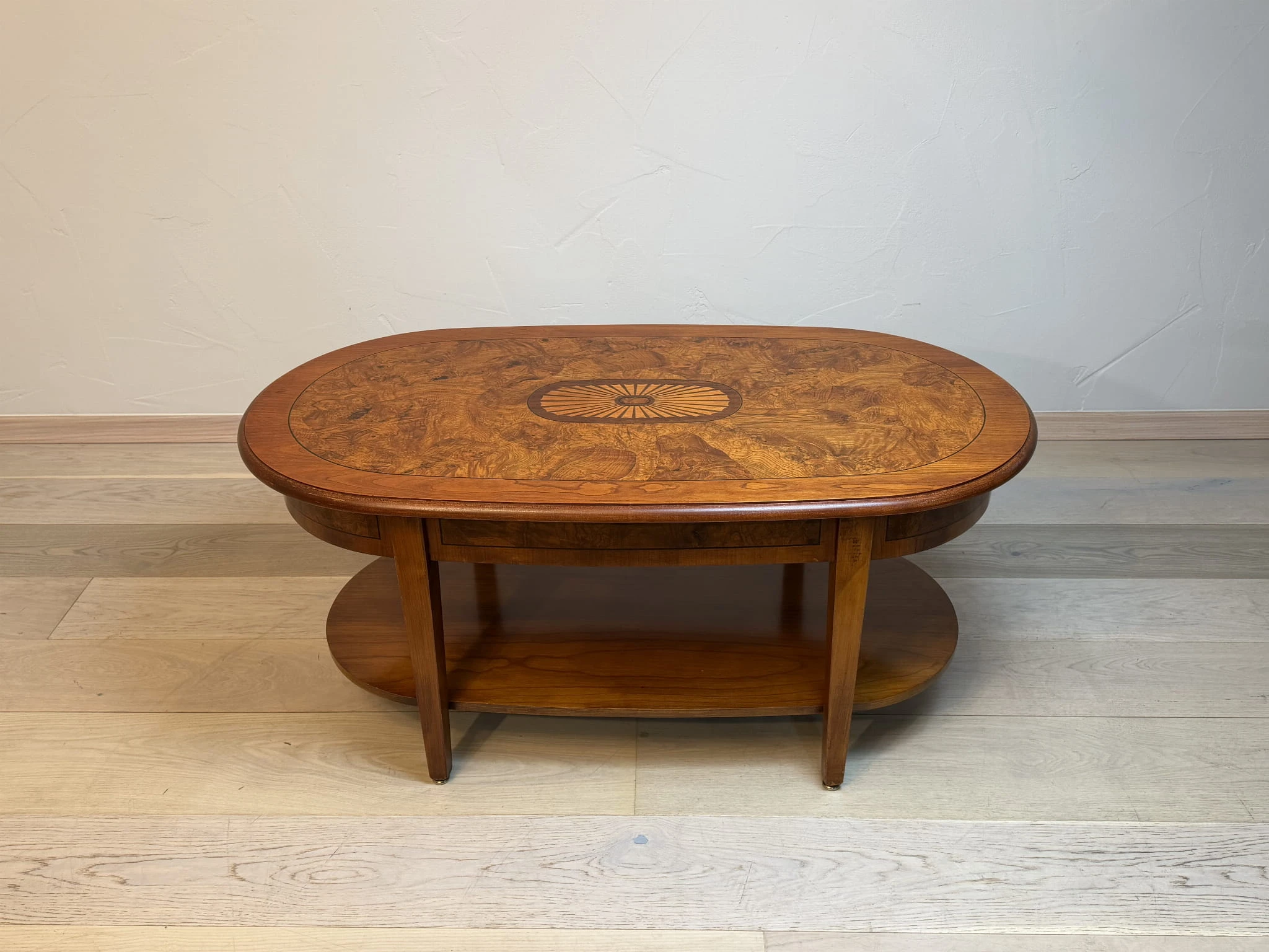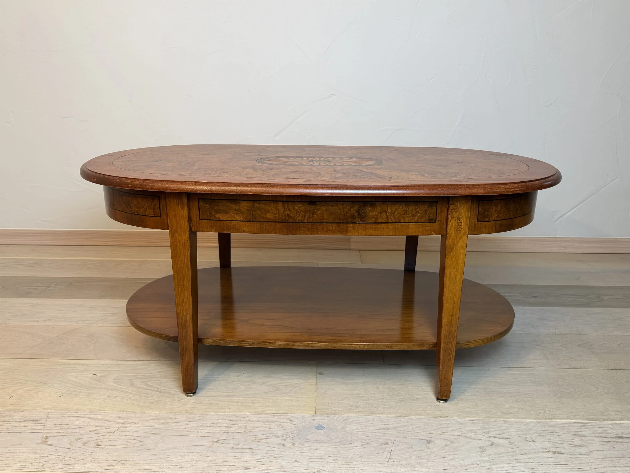 Elegancki drewniany stolik kawowy vintage z lat 80., wyróżniający się dekoracyjnym intarsjowanym blatem oraz ponadczasową, klasyczną formą. Mebel został poddany renowacji, dzięki czemu prezentuje się bardzo dobrze i jest gotowy do użytkowania.