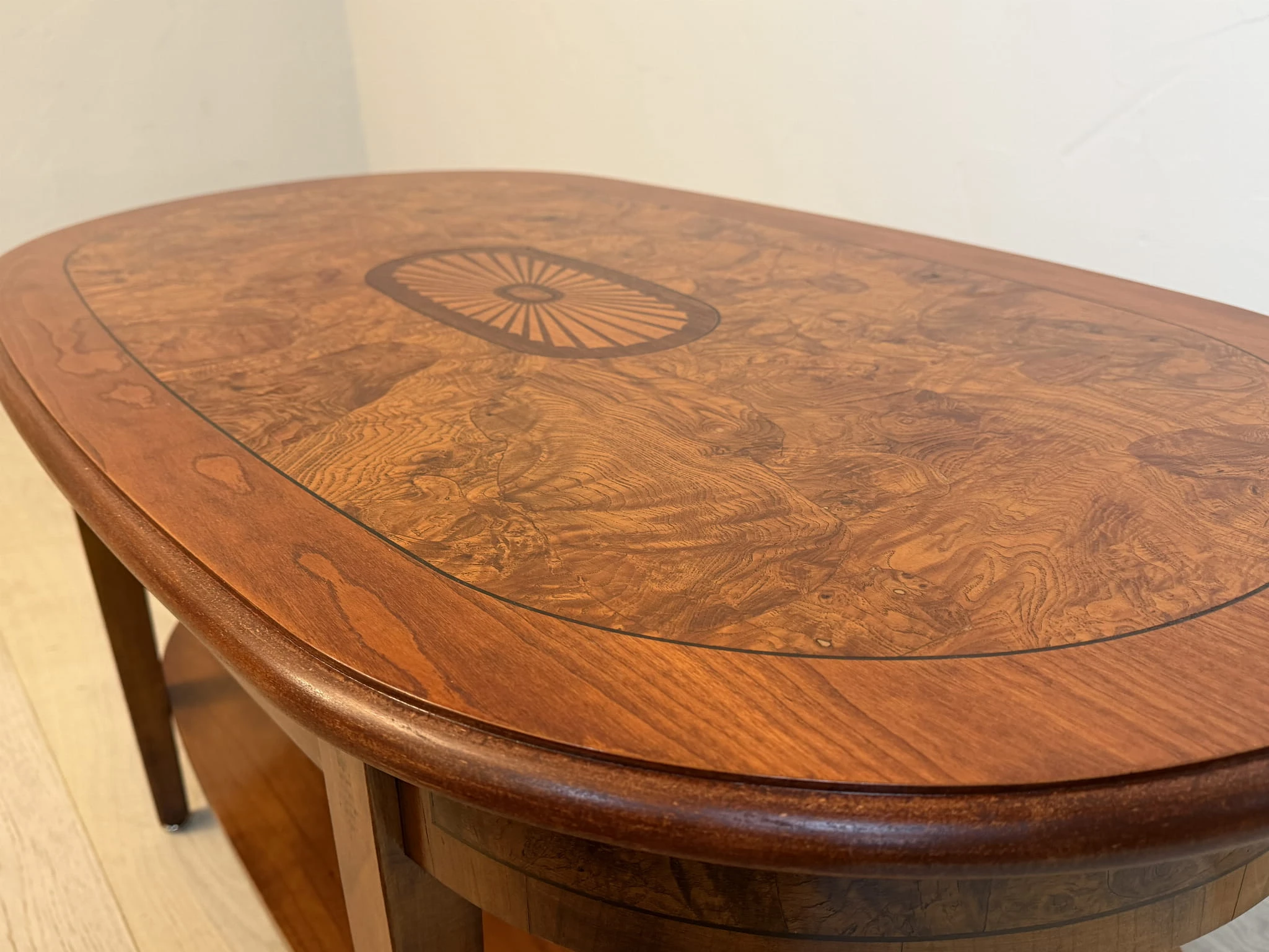 Największą ozdobą stolika jest efektowny blat z dekoracyjną intarsją umieszczoną centralnie, wykonany z różnych gatunków drewna i fornirów. Piękne usłojenie oraz ciepła kolorystyka nadają meblowi szlachetnego charakteru i sprawiają, że stolik staje się wyrazistym elementem wnętrza.