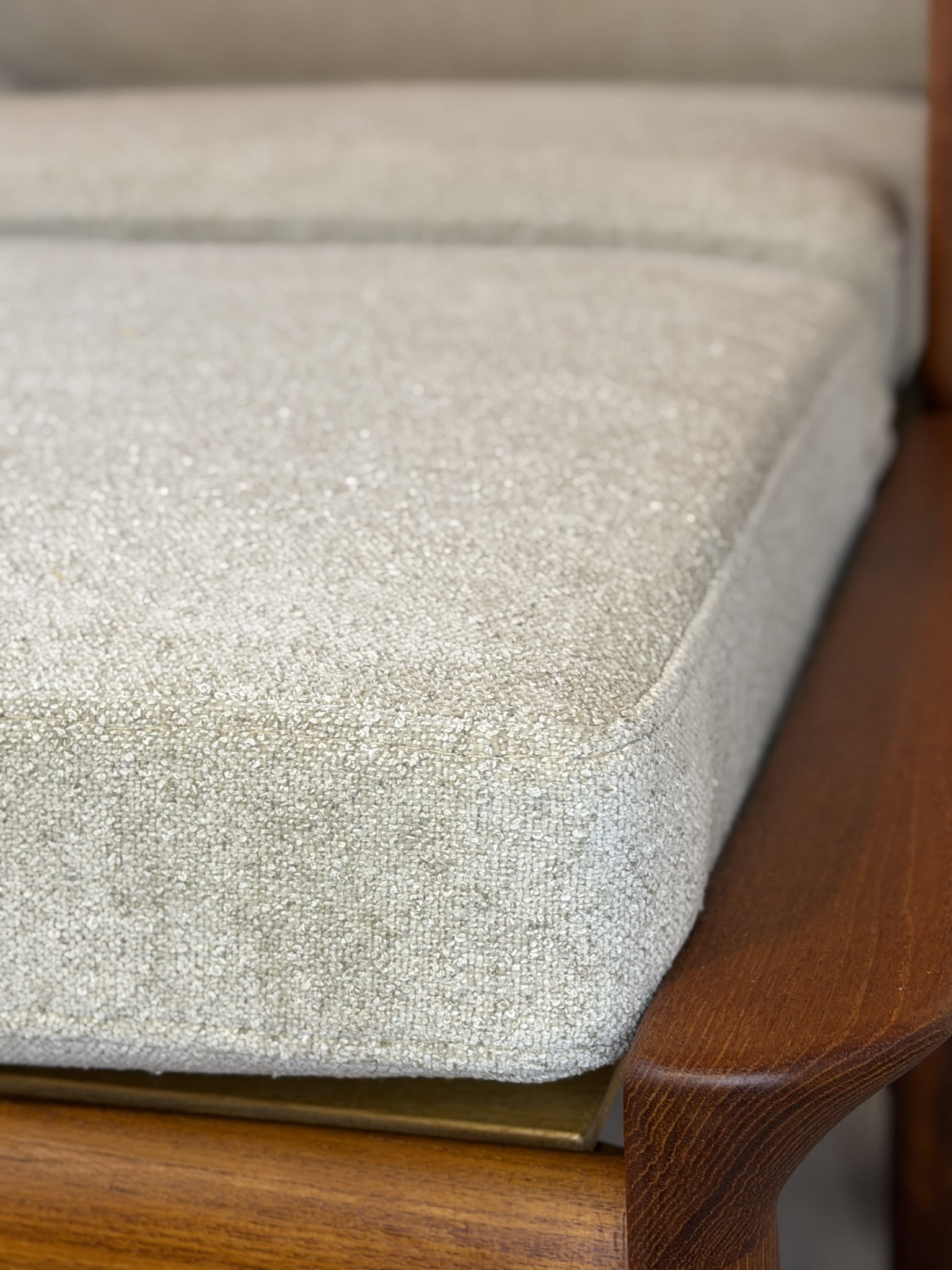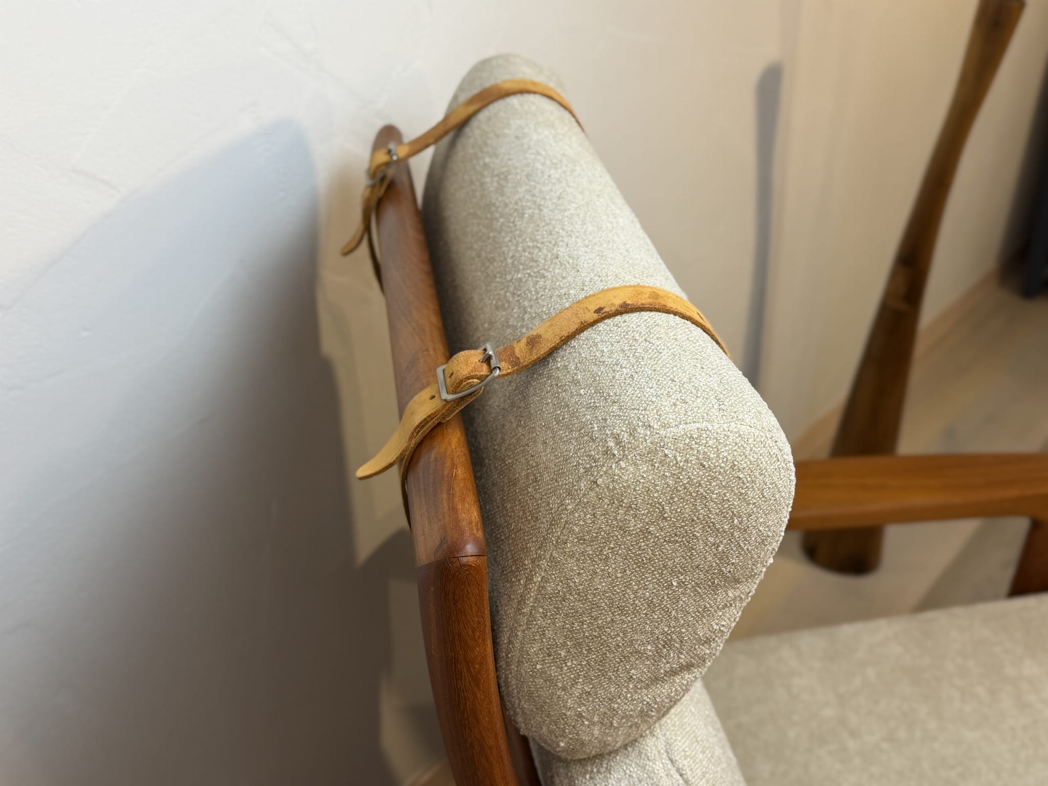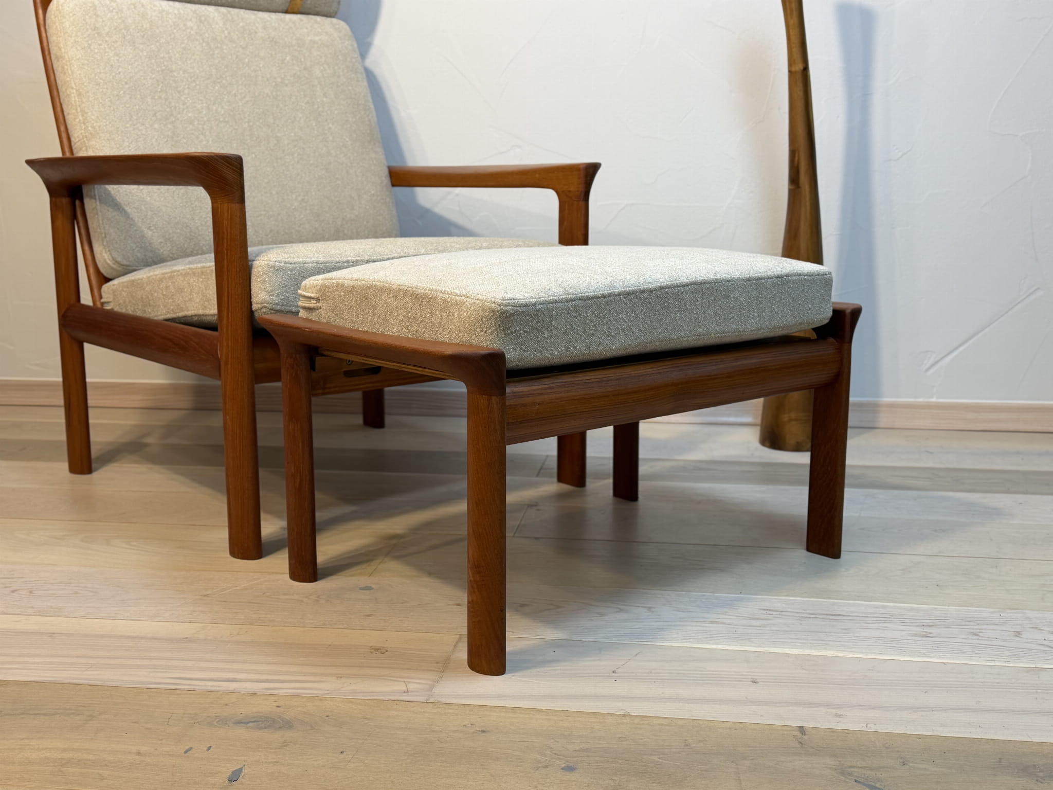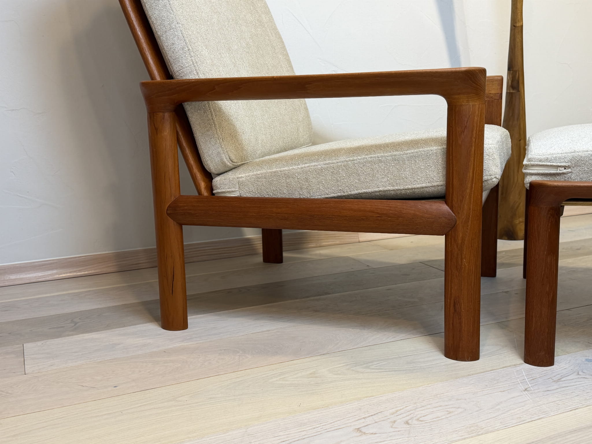 Charakterystyczna, lekko odchylona sylwetka fotela, ergonomiczne podłokietniki oraz dopasowany podnóżek tworzą idealny zestaw do relaksu. Jasna, neutralna tapicerka pięknie kontrastuje z ciepłym odcieniem teaku, podkreślając szlachetność materiałów i rzemieślniczą jakość wykonania.
