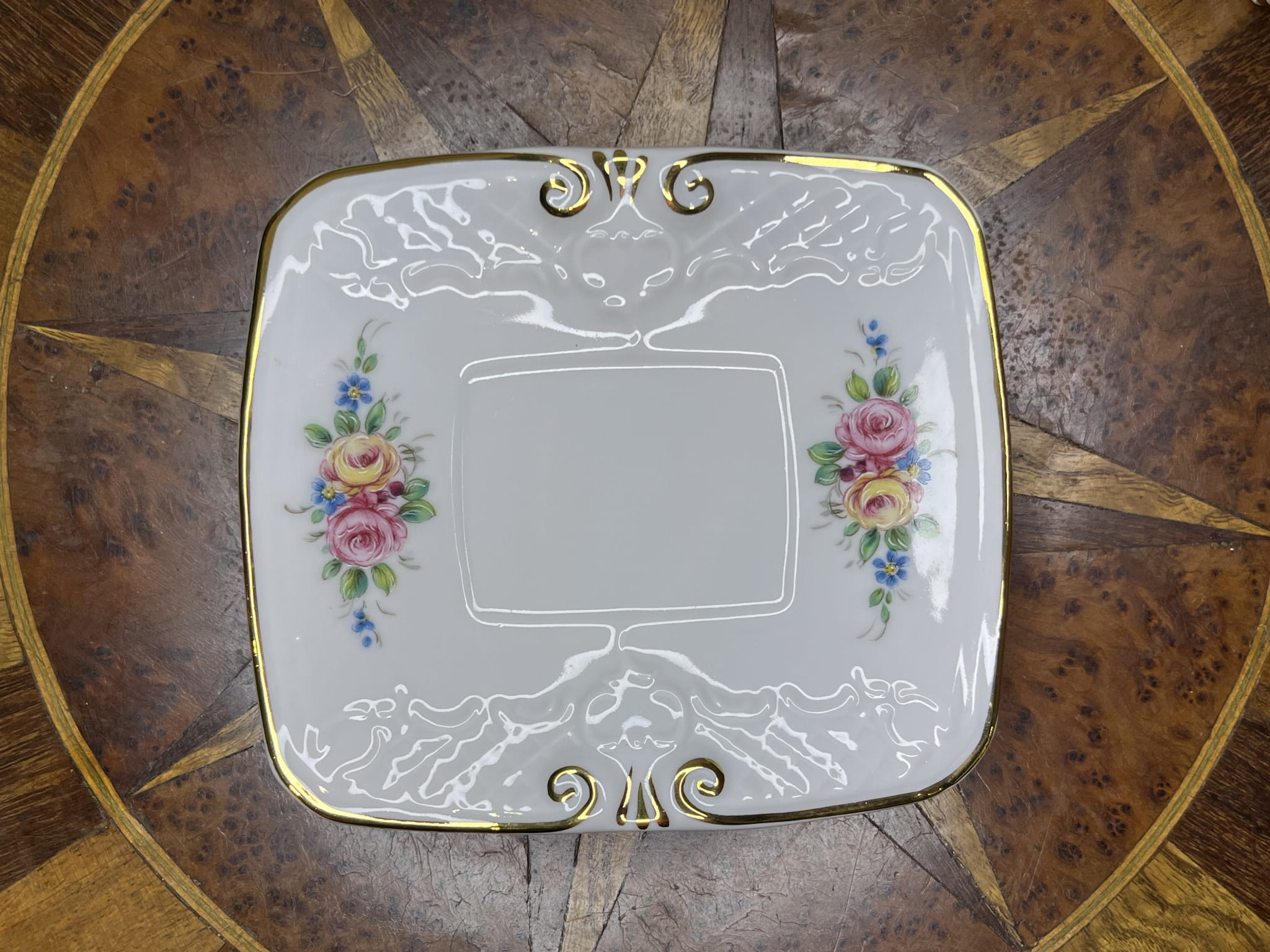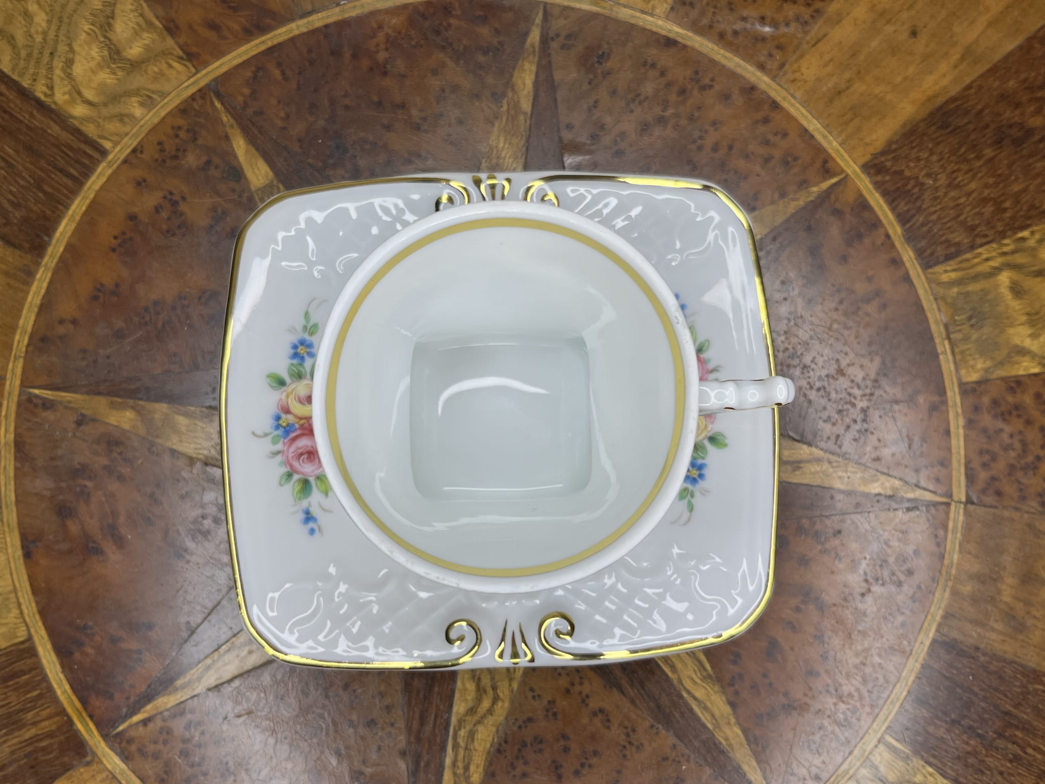 Filiżanka posiada efektowną, lekko profilowaną formę z dekoracyjnymi złoceniami przy podstawie oraz na finezyjnie wyprofilowanym uchwycie. Złocony rant podkreśla elegancję całości. Spodek ma nietypowy, kwadratowy kształt z delikatnie zaokrąglonymi bokami, co nadaje zestawowi wyjątkowego i bardziej nowoczesnego charakteru przy zachowaniu klasycznej stylistyki.