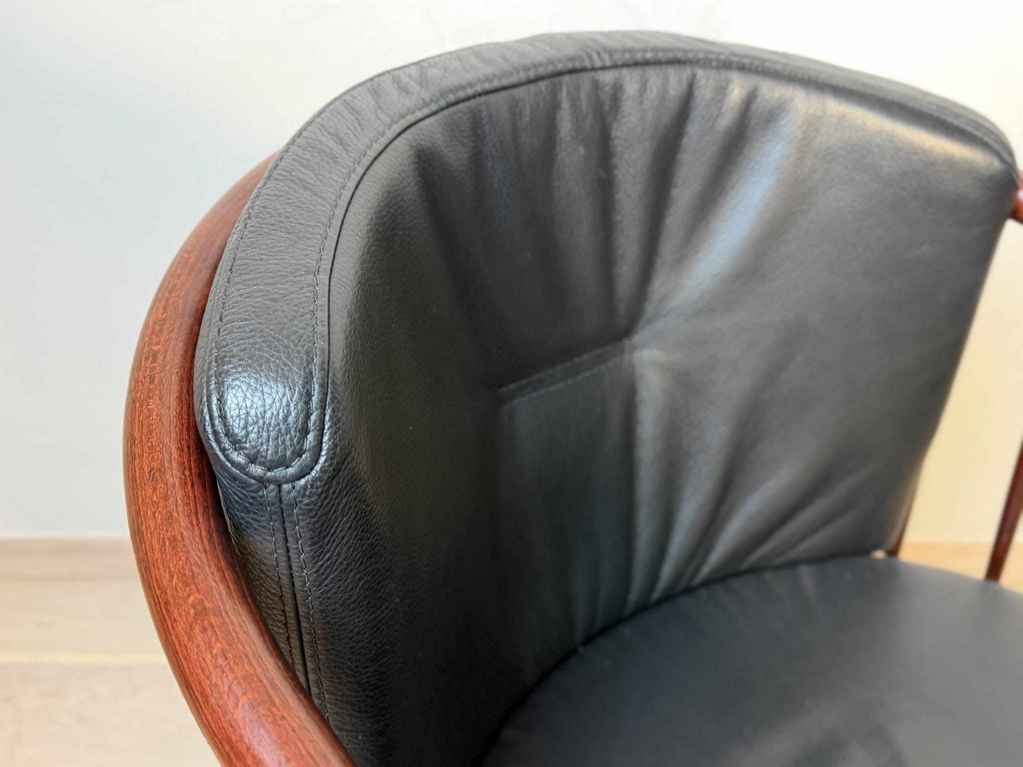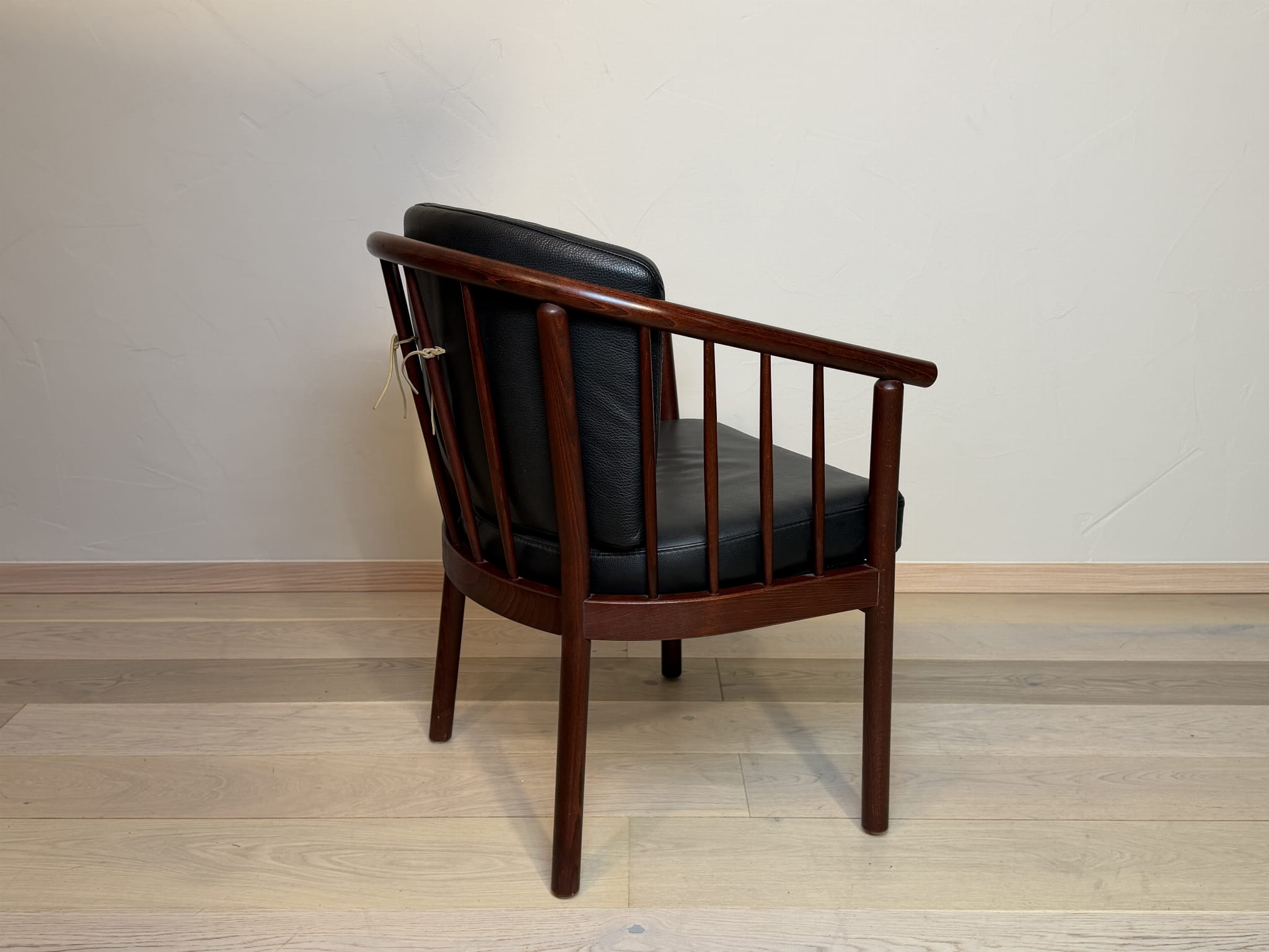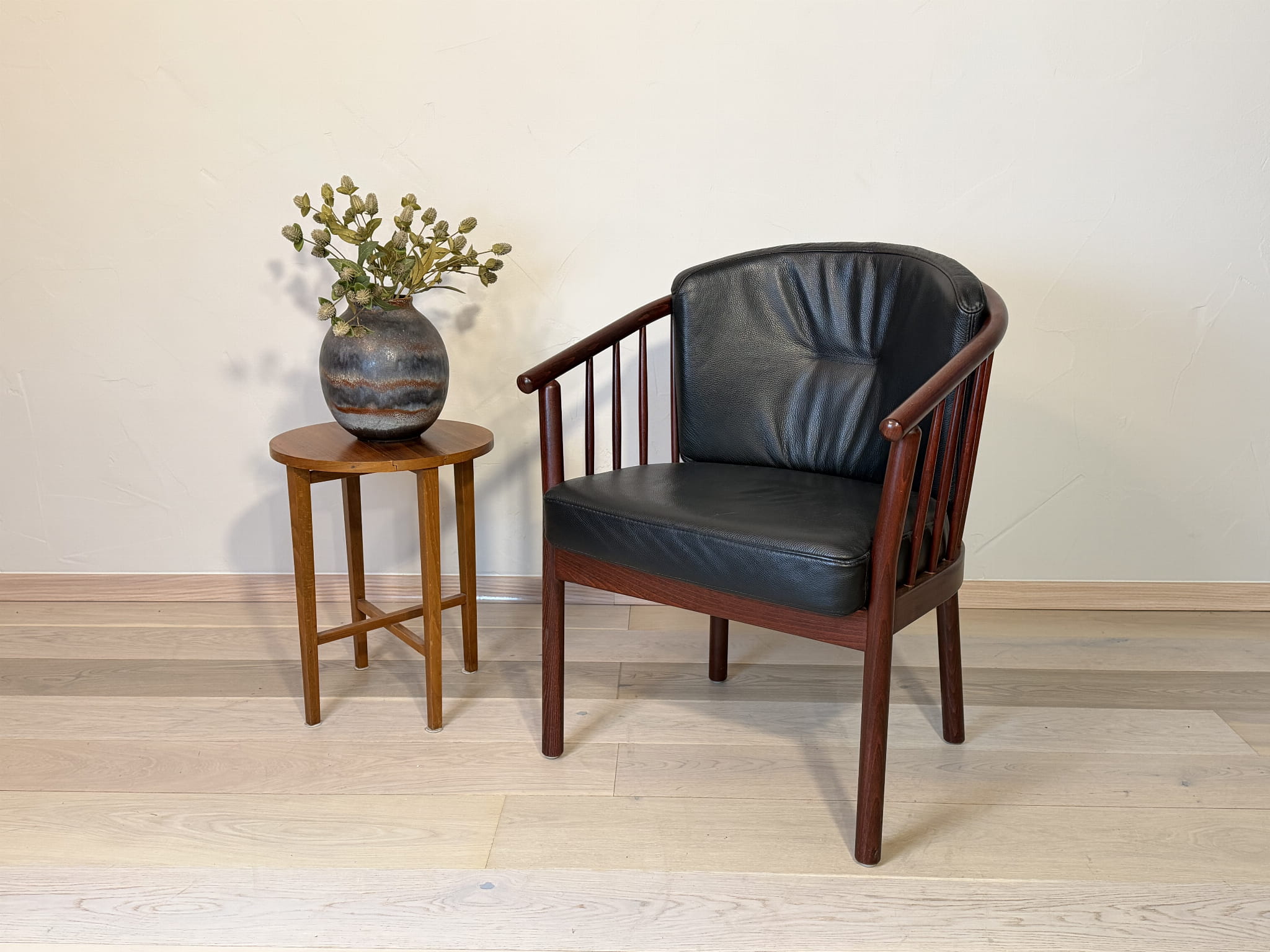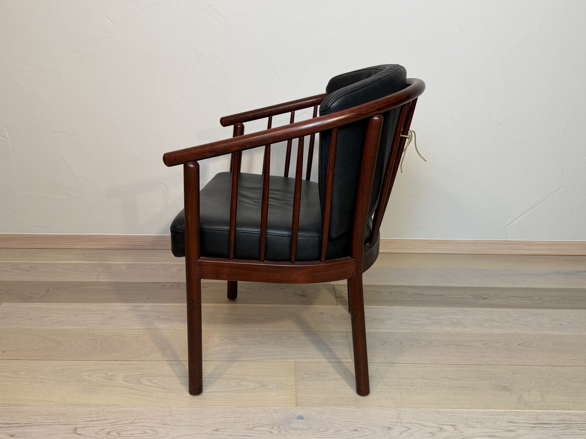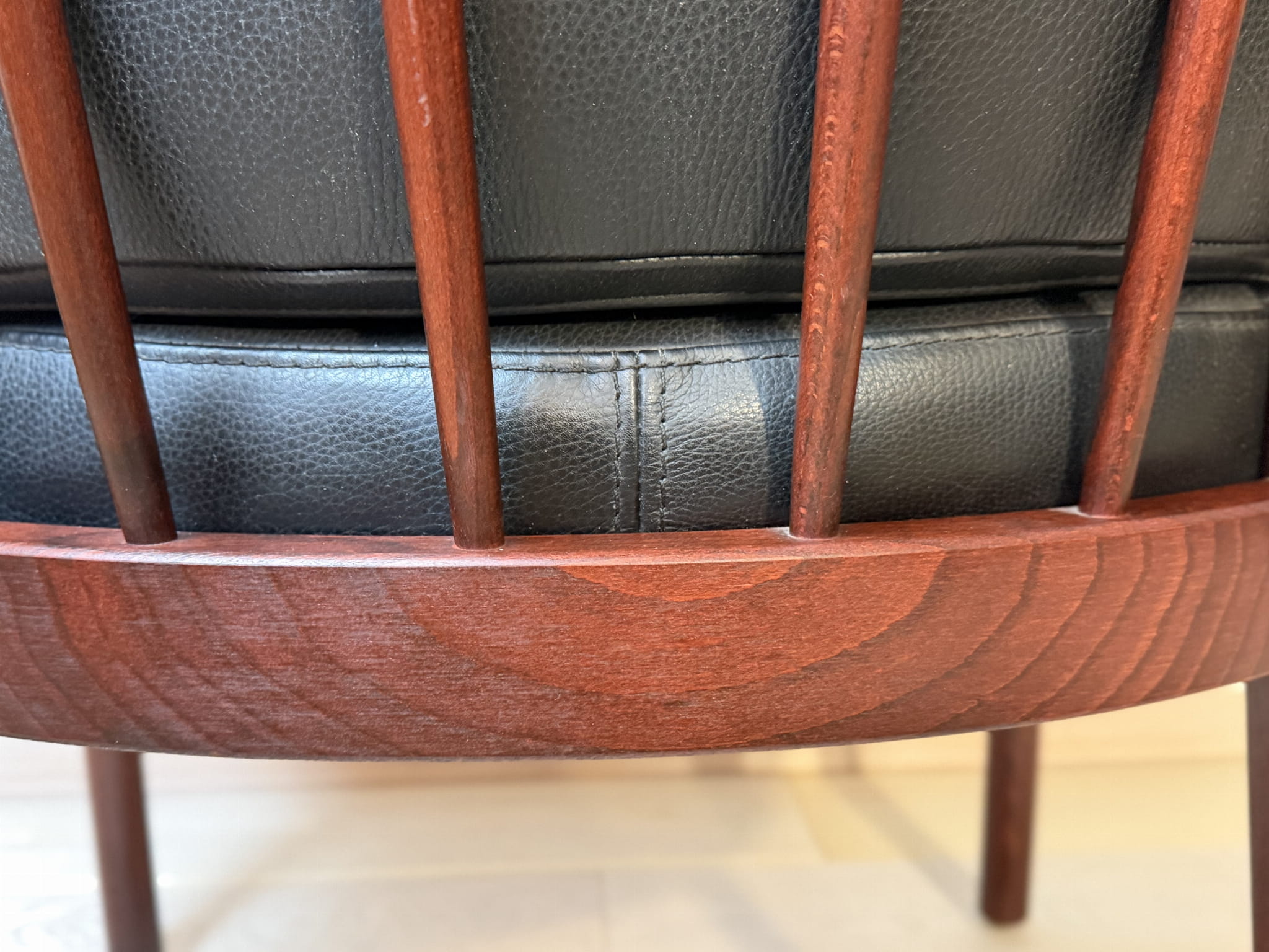 Klasyczny fotel kubełkowy marki Skalma z drewnianą konstrukcją oraz siedziskiem wykonanym ze skóry. Charakterystyczna, otulająca forma kubełka, zaokrąglone podłokietniki oraz pionowe szczebelki oparcia nadają mu elegancki, ponadczasowy wygląd inspirowany skandynawskim wzornictwem drugiej połowy XX wieku.
