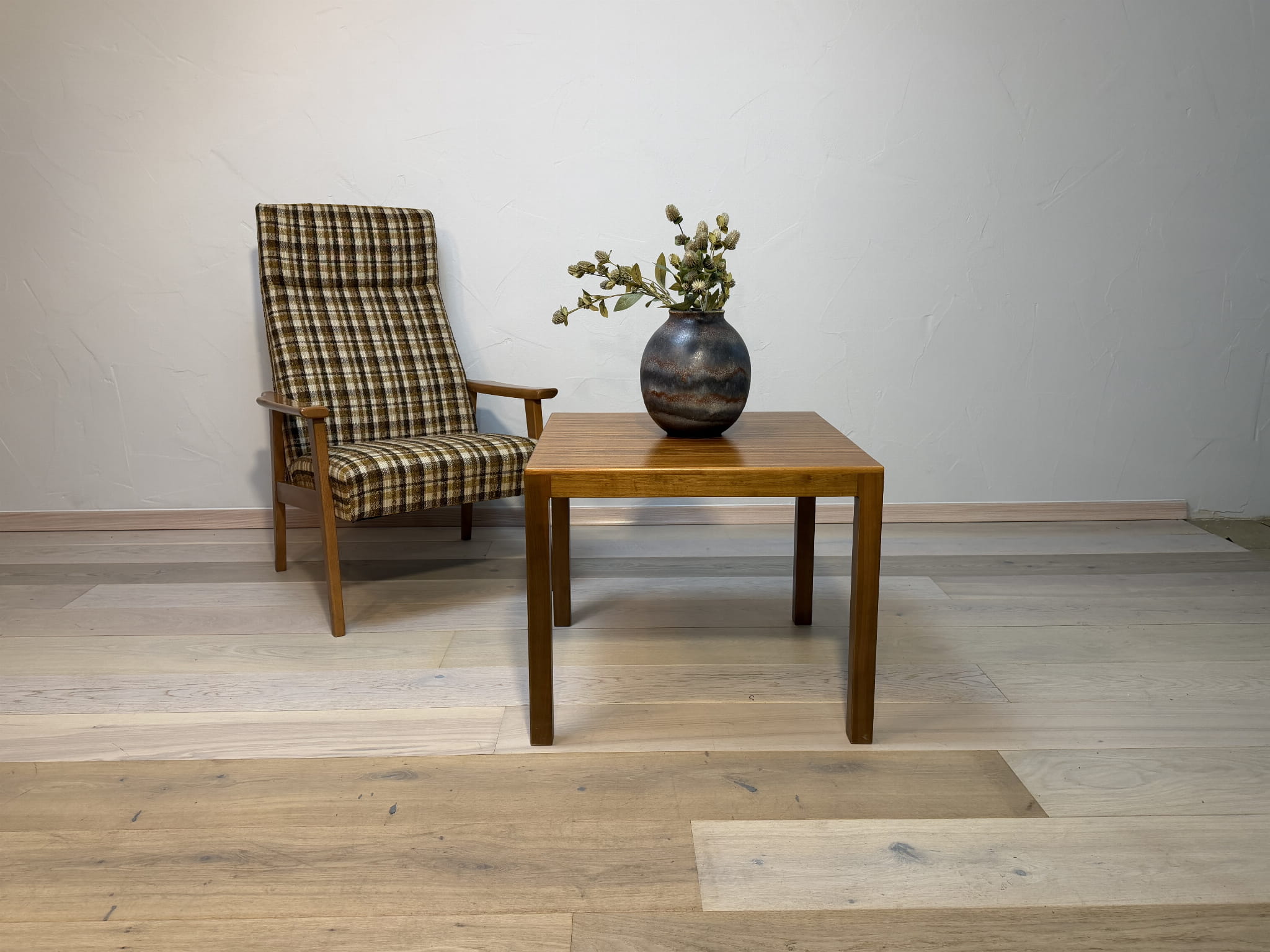 Elegancki fotel vintage w brązową kratę, reprezentujący klasyczny design lat 60./70. Stonowana, ponadczasowa kolorystyka tapicerki w odcieniach brązu i beżu doskonale współgra z ciepłym tonem drewnianej konstrukcji. Smukłe podłokietniki i lekko pochylone oparcie nadają bryle lekkości i zapewniają wysoki komfort użytkowania.
