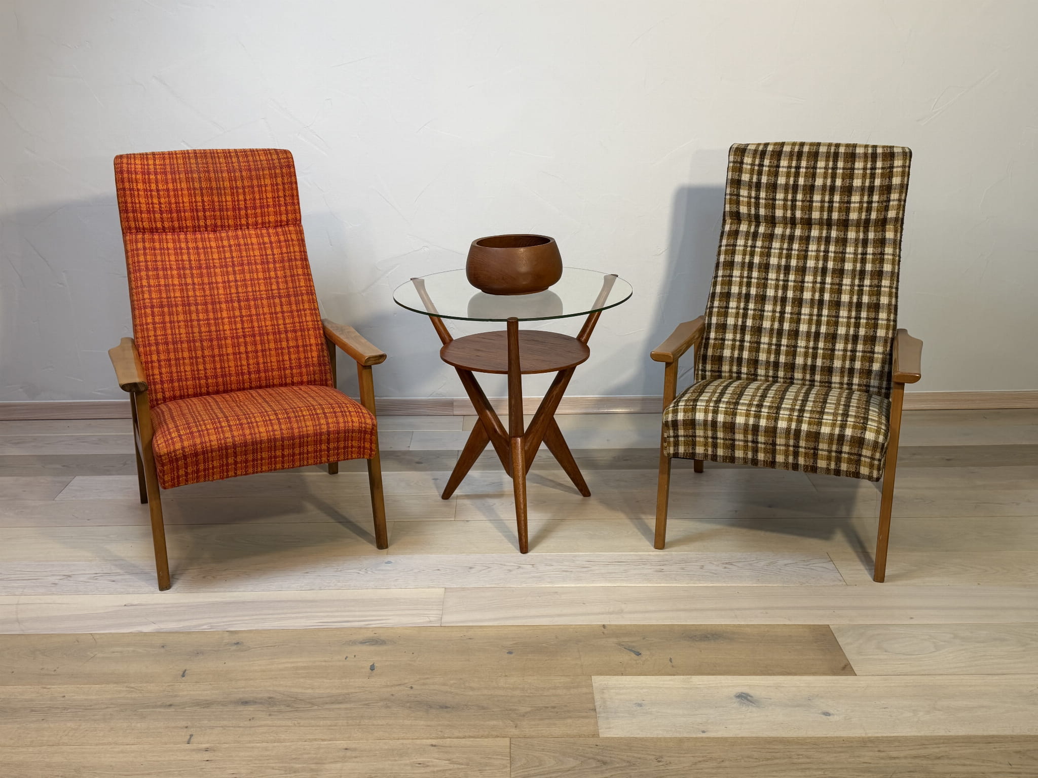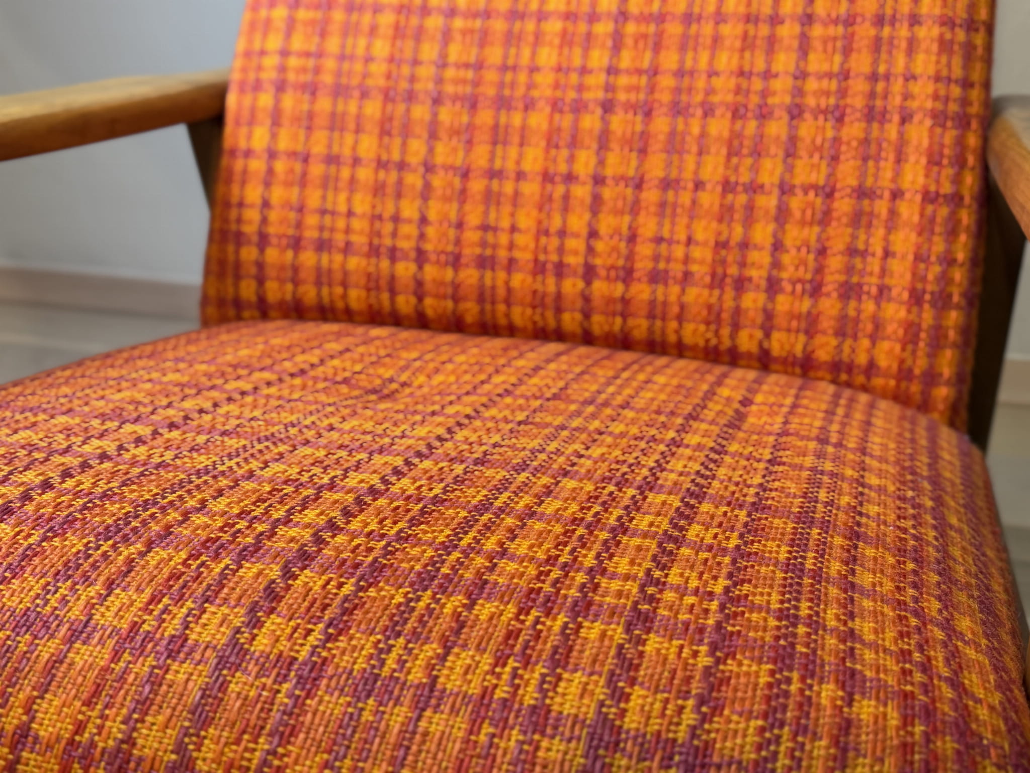 Stylowy fotel vintage w pomarańczową kratę, utrzymany w estetyce lat 60./70. Wyrazista, ciepła kolorystyka tapicerki pięknie kontrastuje z prostą, drewnianą konstrukcją i smukłymi podłokietnikami. Charakterystyczna, lekko pochylona linia oparcia zapewnia wygodę i podkreśla modernistyczny charakter mebla.