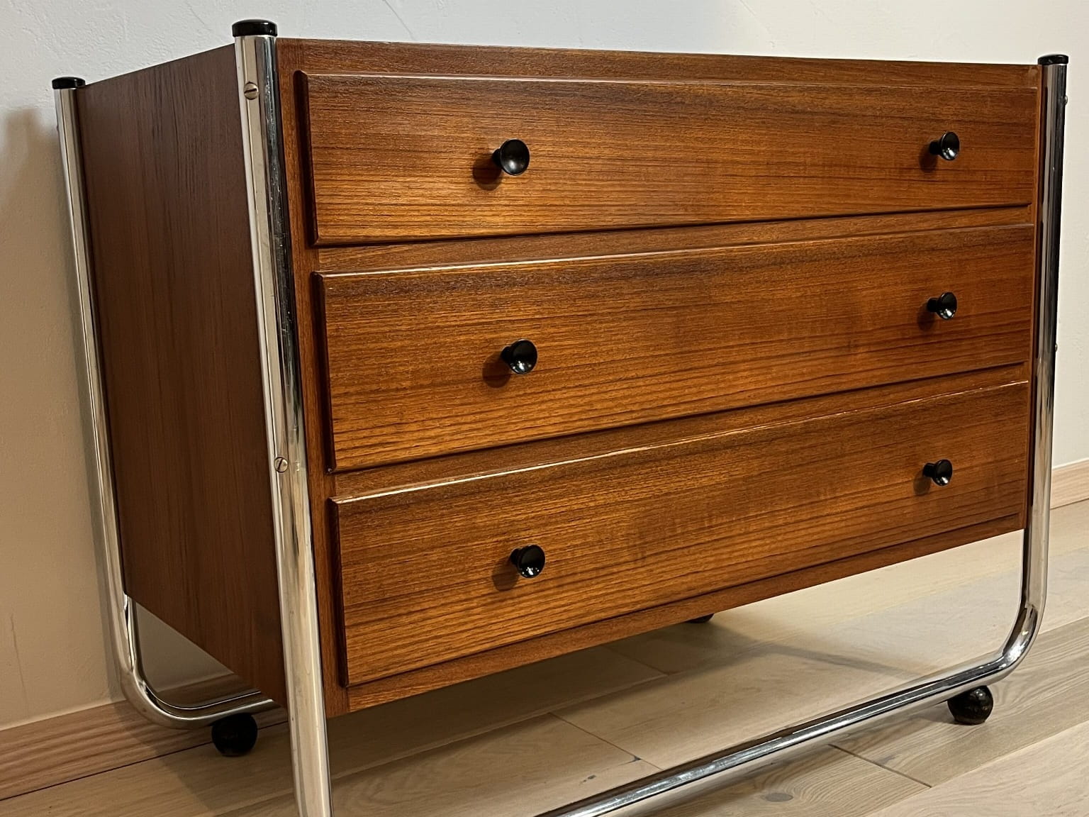 Modernistyczna komoda z lat 60./70. wykonana z litego drewna oraz chromowanej stalowej ramy w stylu Bauhaus.
