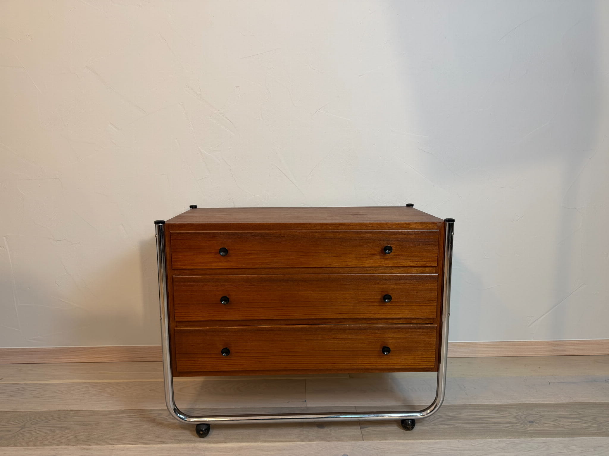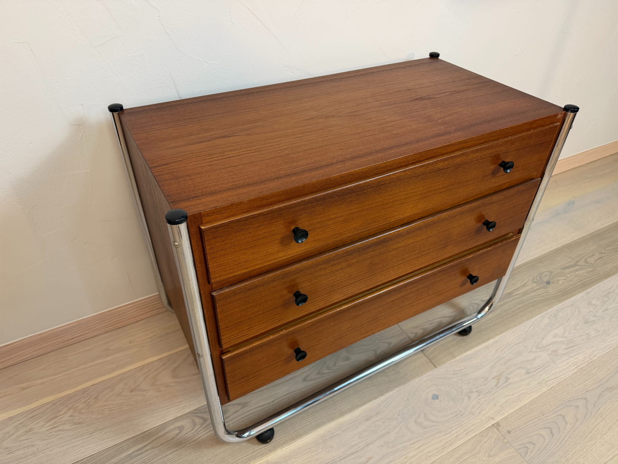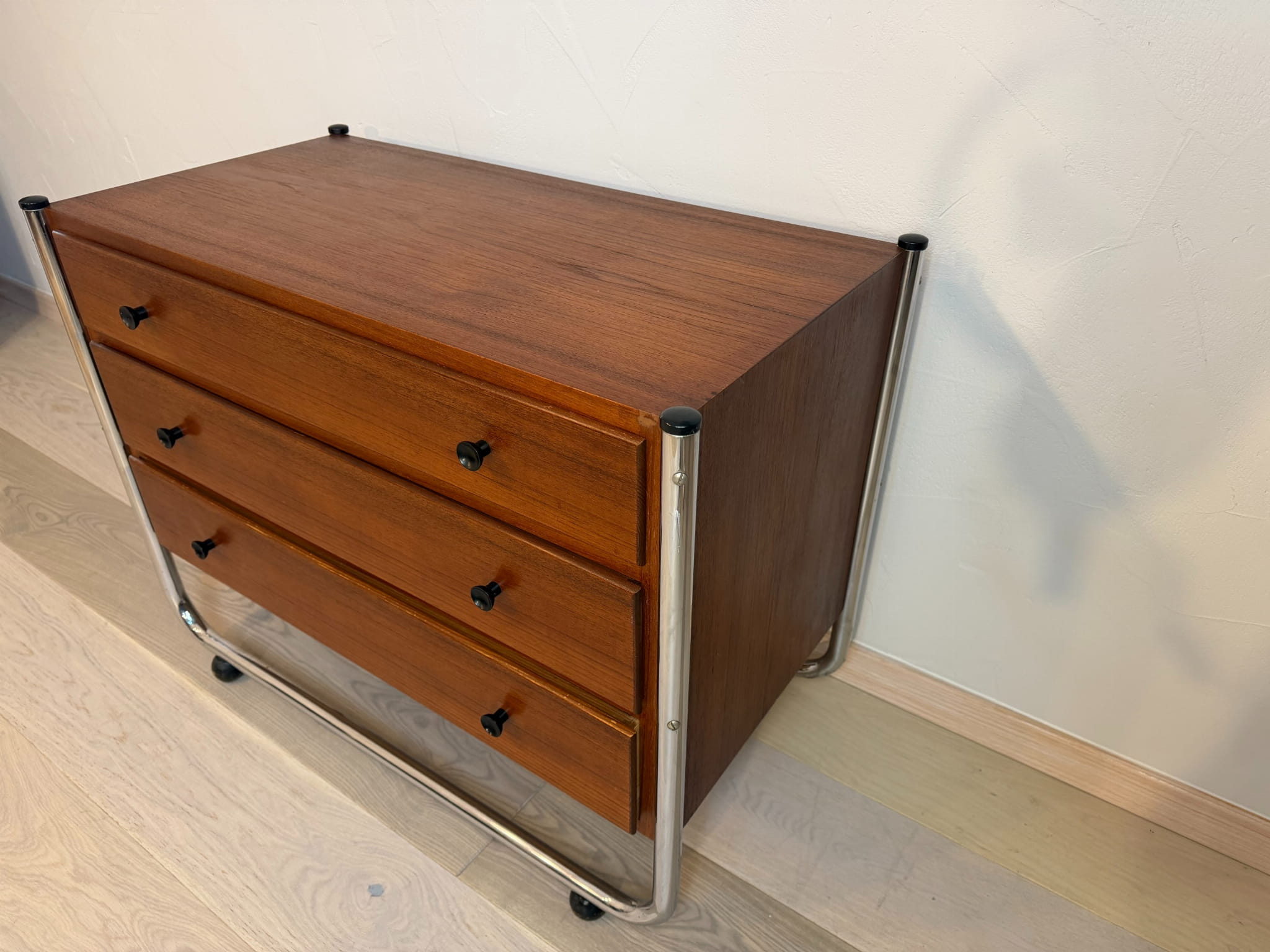 Komoda wyposażona jest w trzy pojemne szuflady, które zapewniają praktyczne miejsce do przechowywania. Chromowana konstrukcja z okrągłych rur nadaje meblowi stabilność, a jednocześnie wpisuje go w estetykę mebli projektantów takich jak Müller, Horst Bruning czy Tecta.