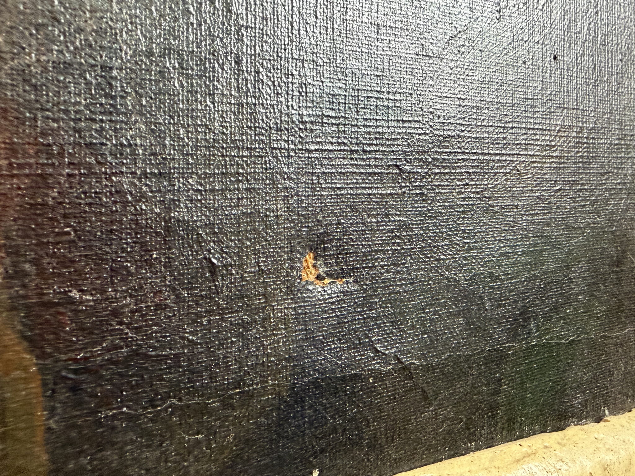 Dobry stan ogólny. Obraz posiada drobne wgniecenie powierzchni malarskiej widoczne na zdjęciu. Rama z naturalnymi śladami wieku i użytkowania.