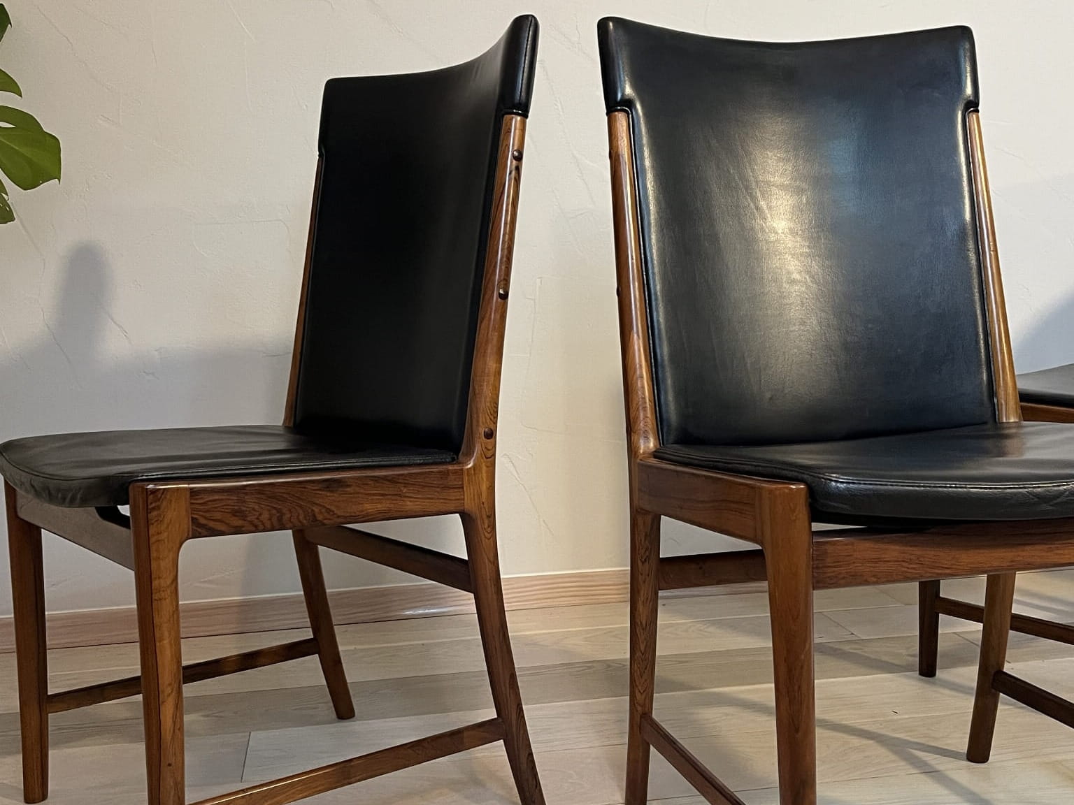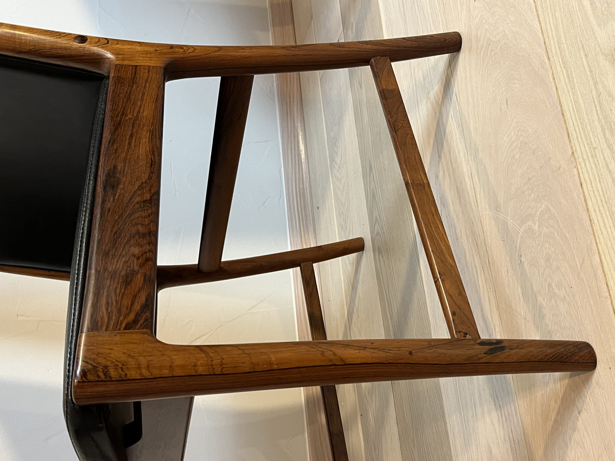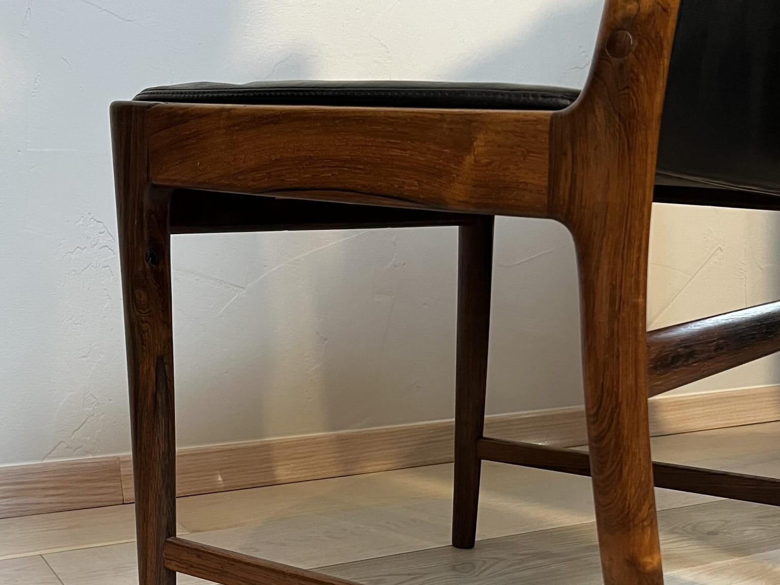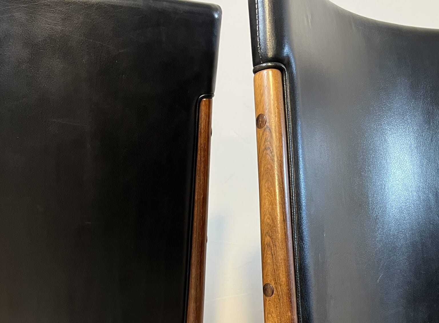 Krzeseł palisandrowe zaprojektowane przez Kai’a Lyngfeldt Larsena dla Søren Willadsen Møbelfabrik. Duński design lat 60. w stylu mid-century modern, łączący elegancką konstrukcję z palisandru z wygodną czarną tapicerką.