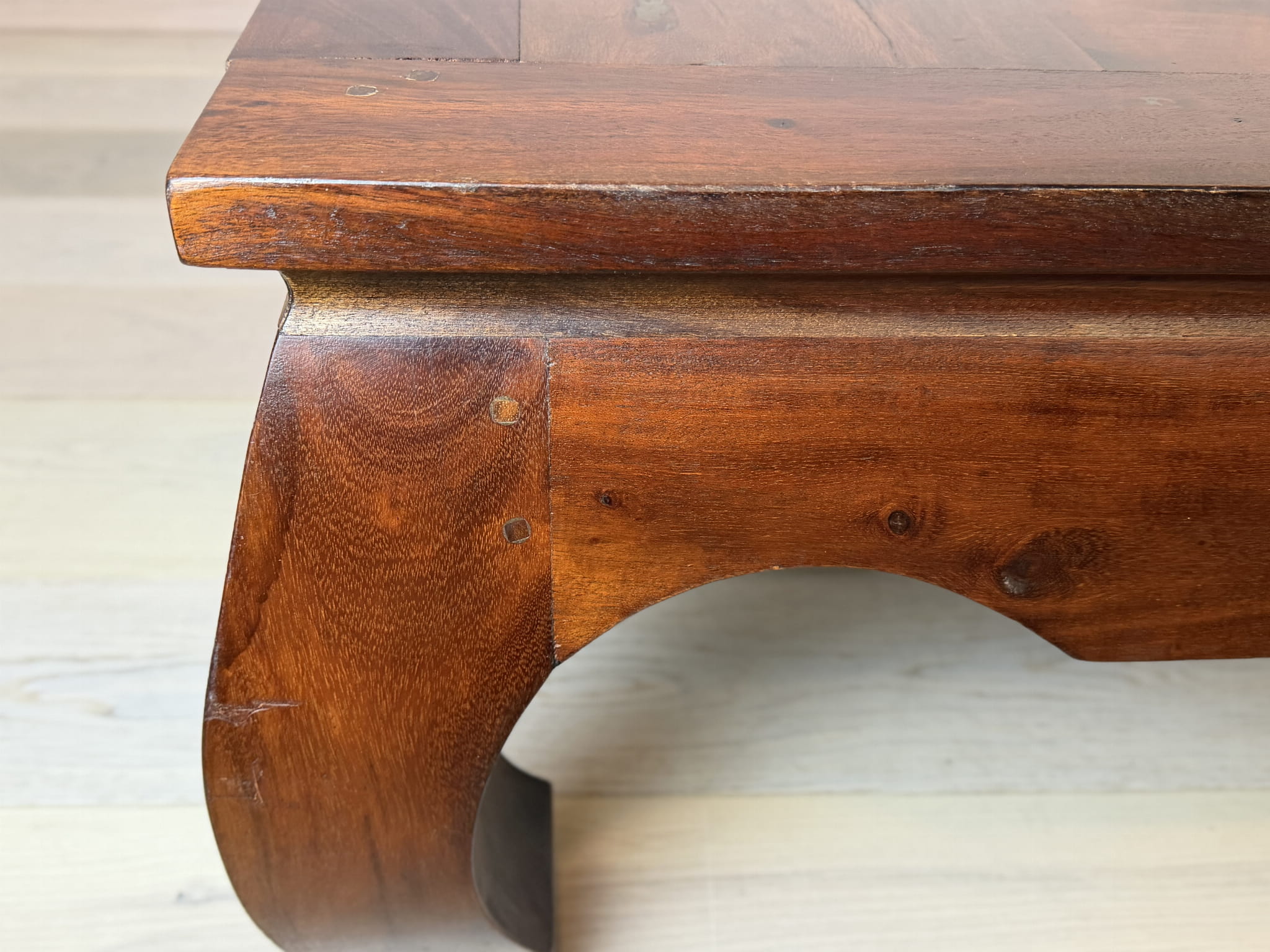 Drewno najprawdopodobniej akacja (sheesham / palisander indyjski) – twarde, ciężkie i trwałe, często stosowane w meblach kolonialnych. Widoczne naturalne sęki i różnice w kolorze są cechą materiału i świadczą o jego litym pochodzeniu. Stolik zachowany w dobrym stanie, z naturalnymi śladami użytkowania typowymi dla mebli z litego drewna.
