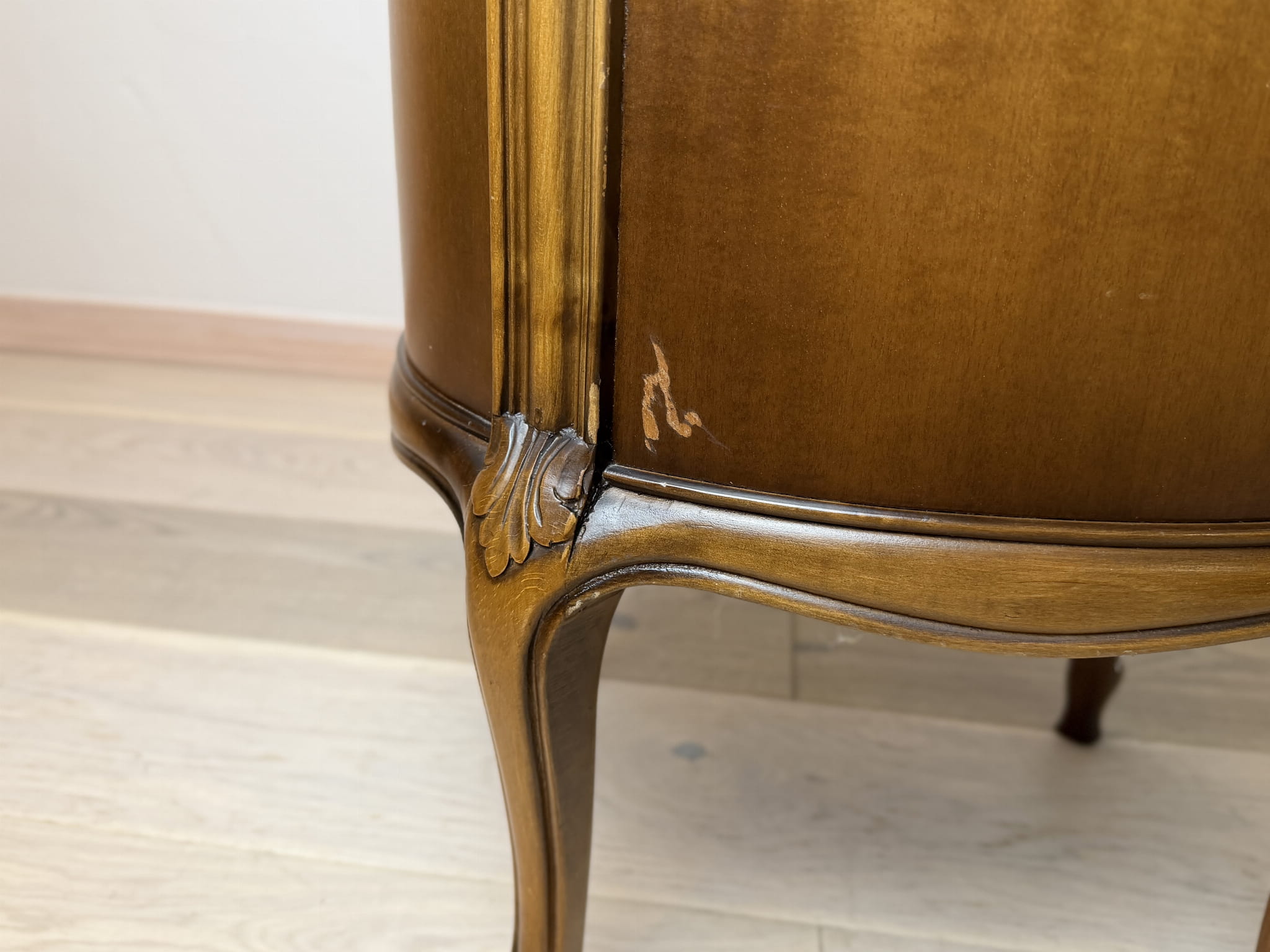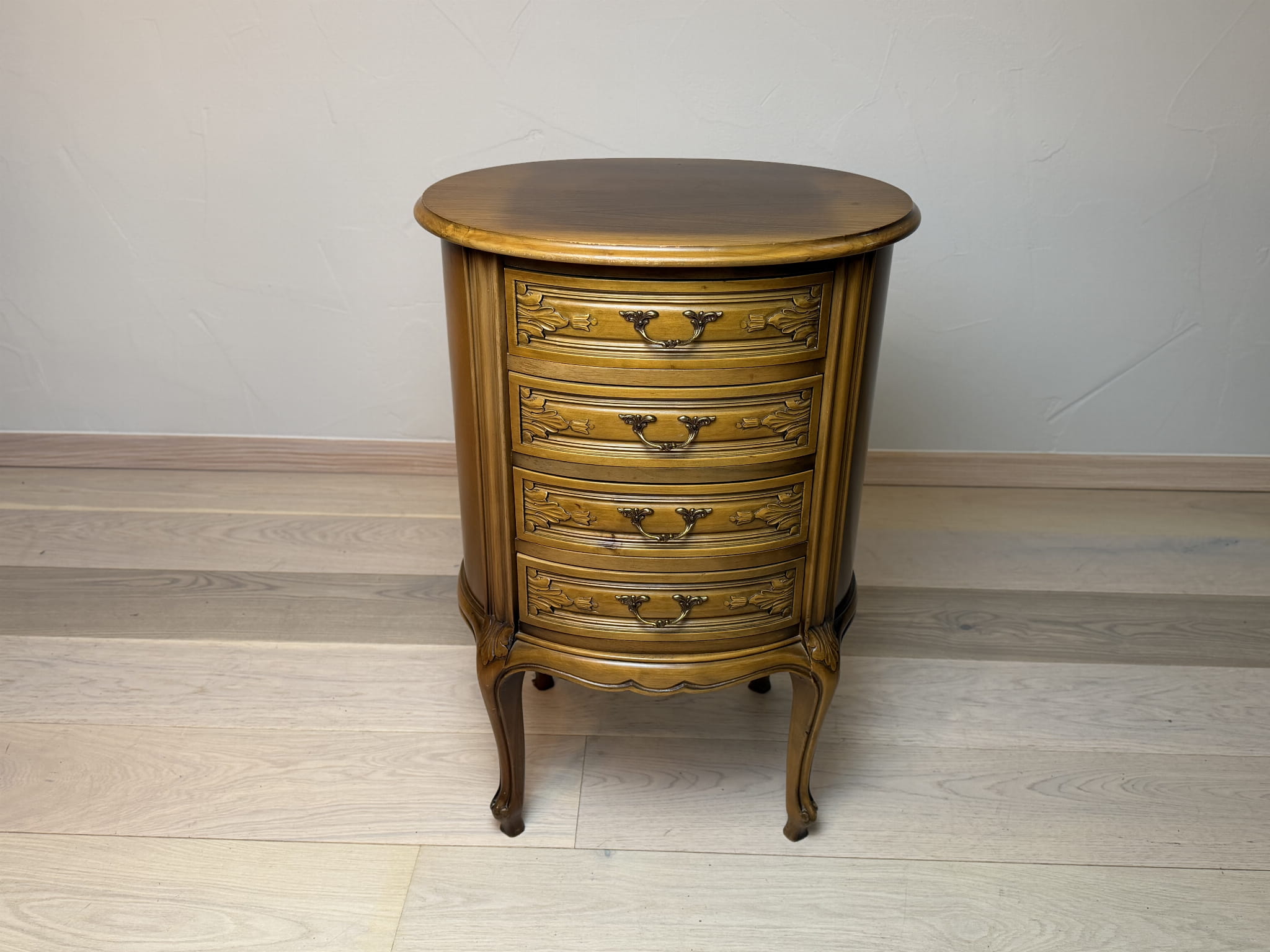 Elegancka mała komoda w stylu Louis XV / Regency, wykonana z drewna wiśniowego, o harmonijnej, zaokrąglonej bryle i subtelnie wygiętych nogach typu cabriole. Front zdobią cztery szuflady z dekoracyjnymi frezowaniami oraz klasycznymi metalowymi uchwytami, charakterystycznymi dla estetyki XVIII-wiecznej Francji i jej późniejszych interpretacji.