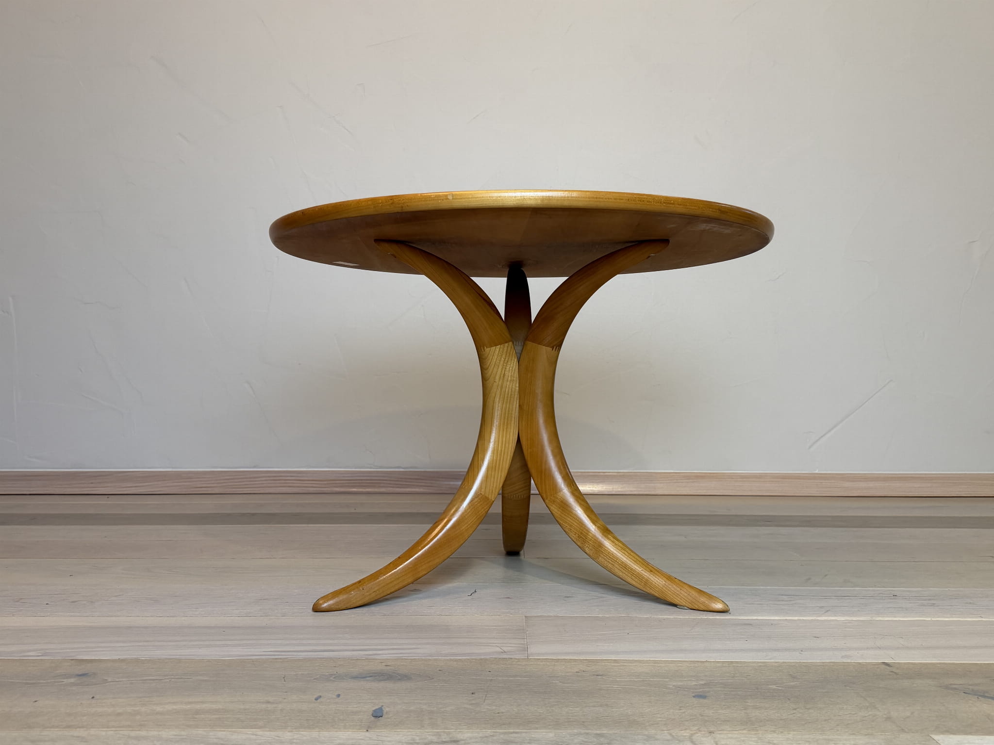 Stylowy okrągły stolik kawowy z litego drewna, wyprodukowany w latach 60. przez firmę Alma. Mebel utrzymany w estetyce mid-century modern / vintage, z charakterystyczną, rzeźbiarsko ukształtowaną podstawą, typową dla wzornictwa tego okresu. Naturalny rysunek drewna oraz ciepły odcień wykończenia podkreślają jego ponadczasowy charakter.