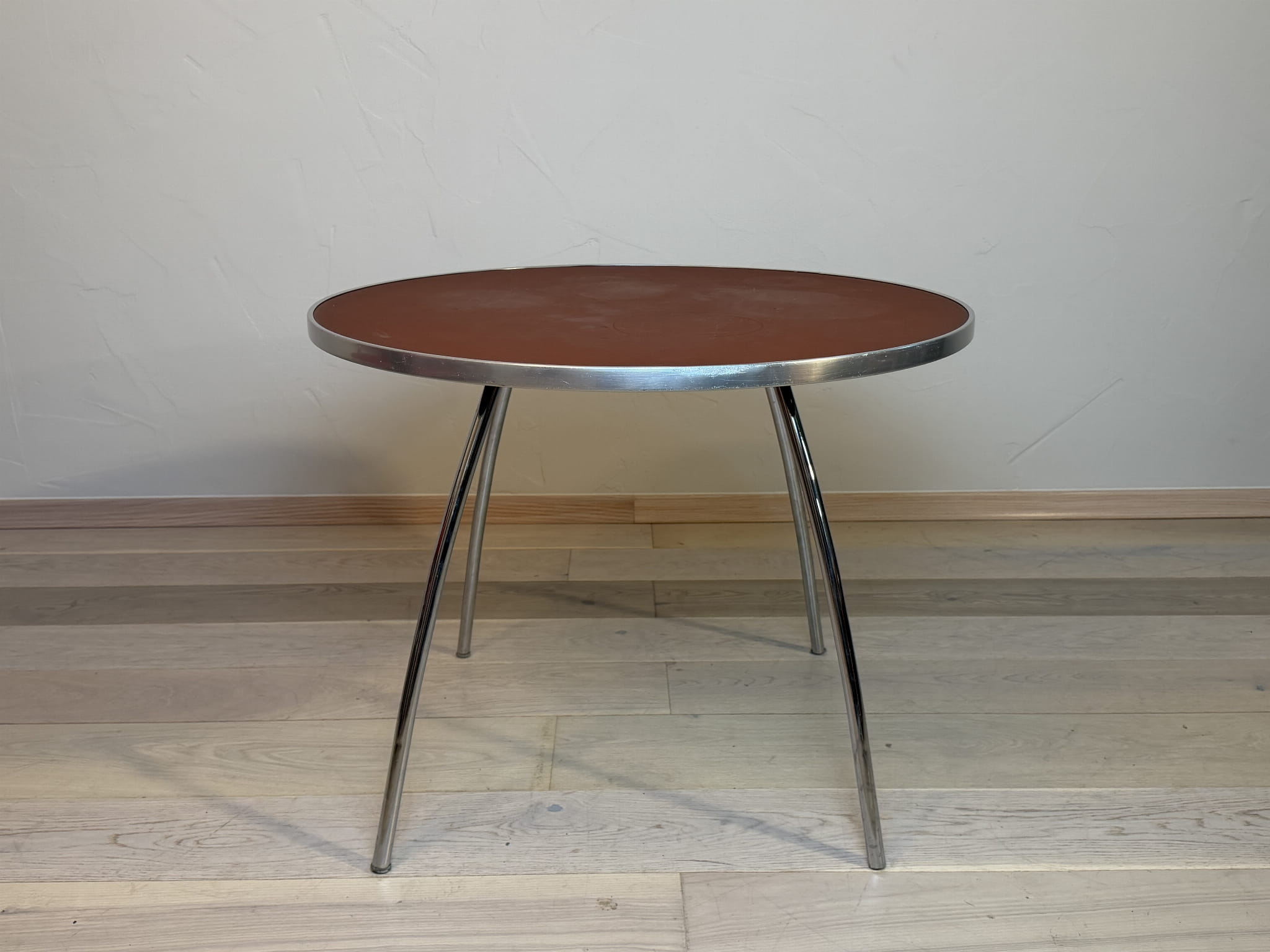 Stylowy okrągły stolik produkcji Mauser Werke, utrzymany w estetyce modernistycznej charakterystycznej dla niemieckiego wzornictwa powojennego. Model wyróżnia się ceglanym blatem o wyrazistym, ciepłym kolorze oraz chromowaną, smukłą konstrukcją nóg, która nadaje całości lekkości i industrialnego charakteru.