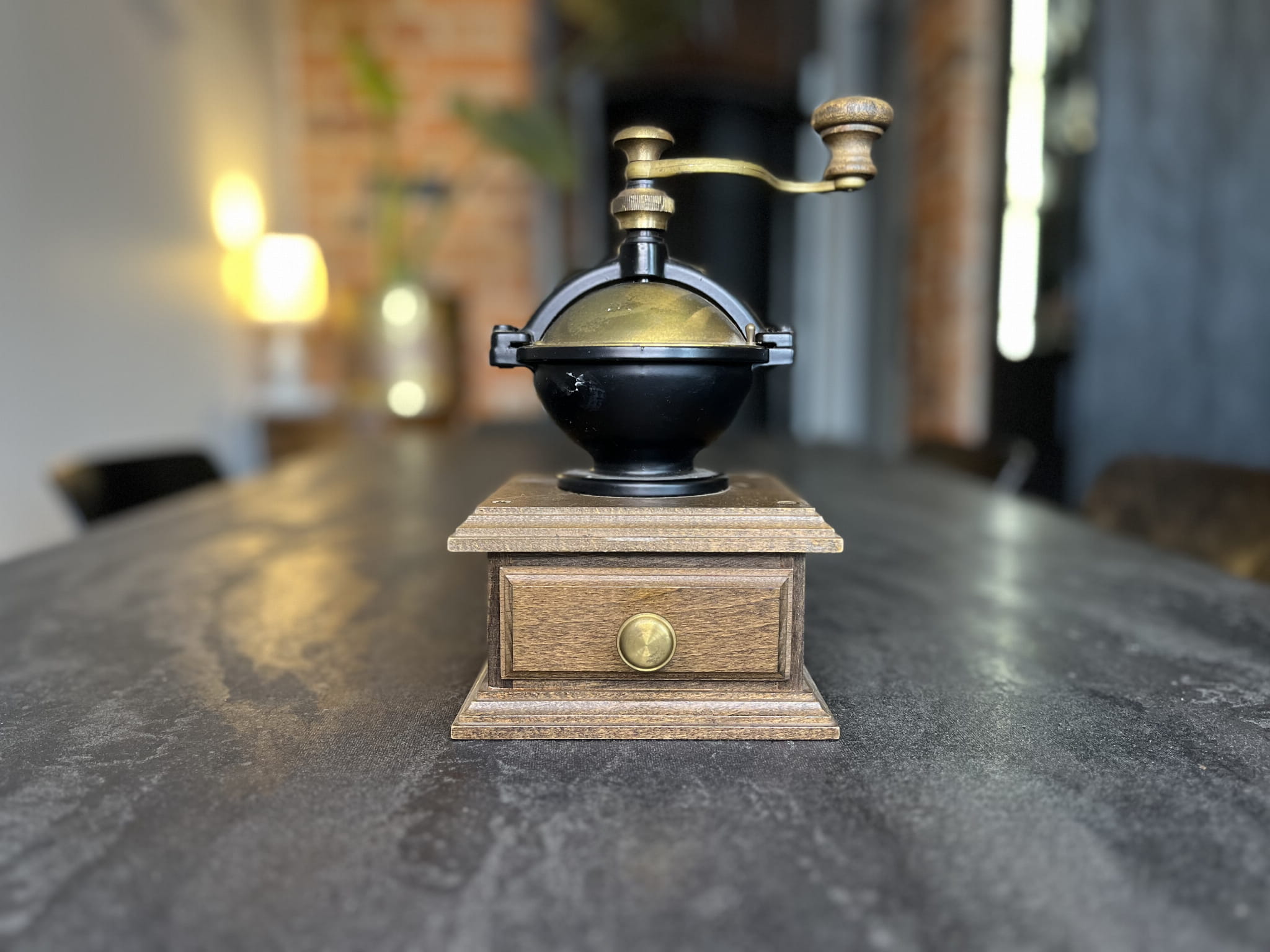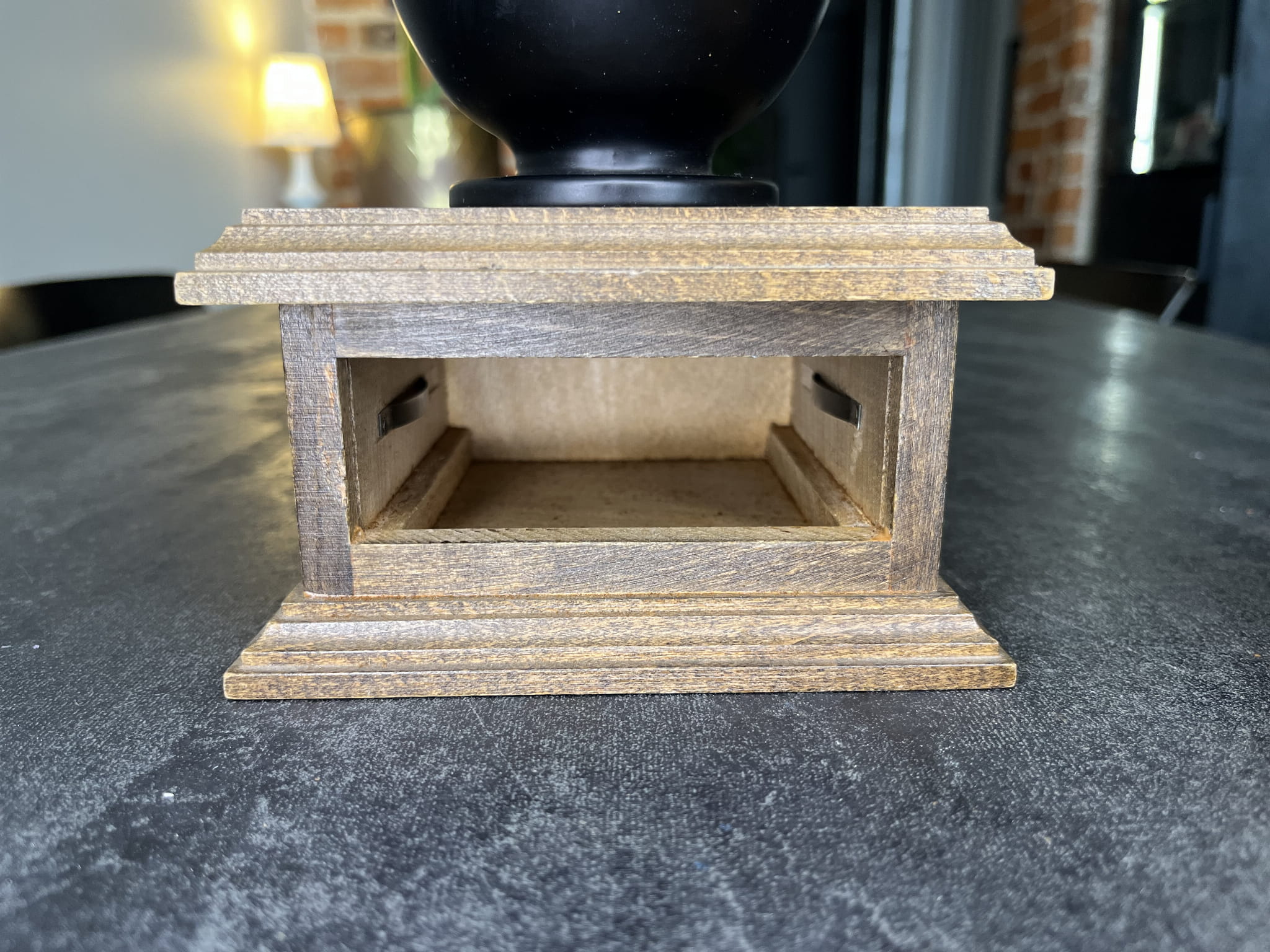 Drewniana podstawa z wysuwaną szufladką umożliwia wygodne odbieranie zmielonej kawy. Szufladka wykończona mosiężnym uchwytem.