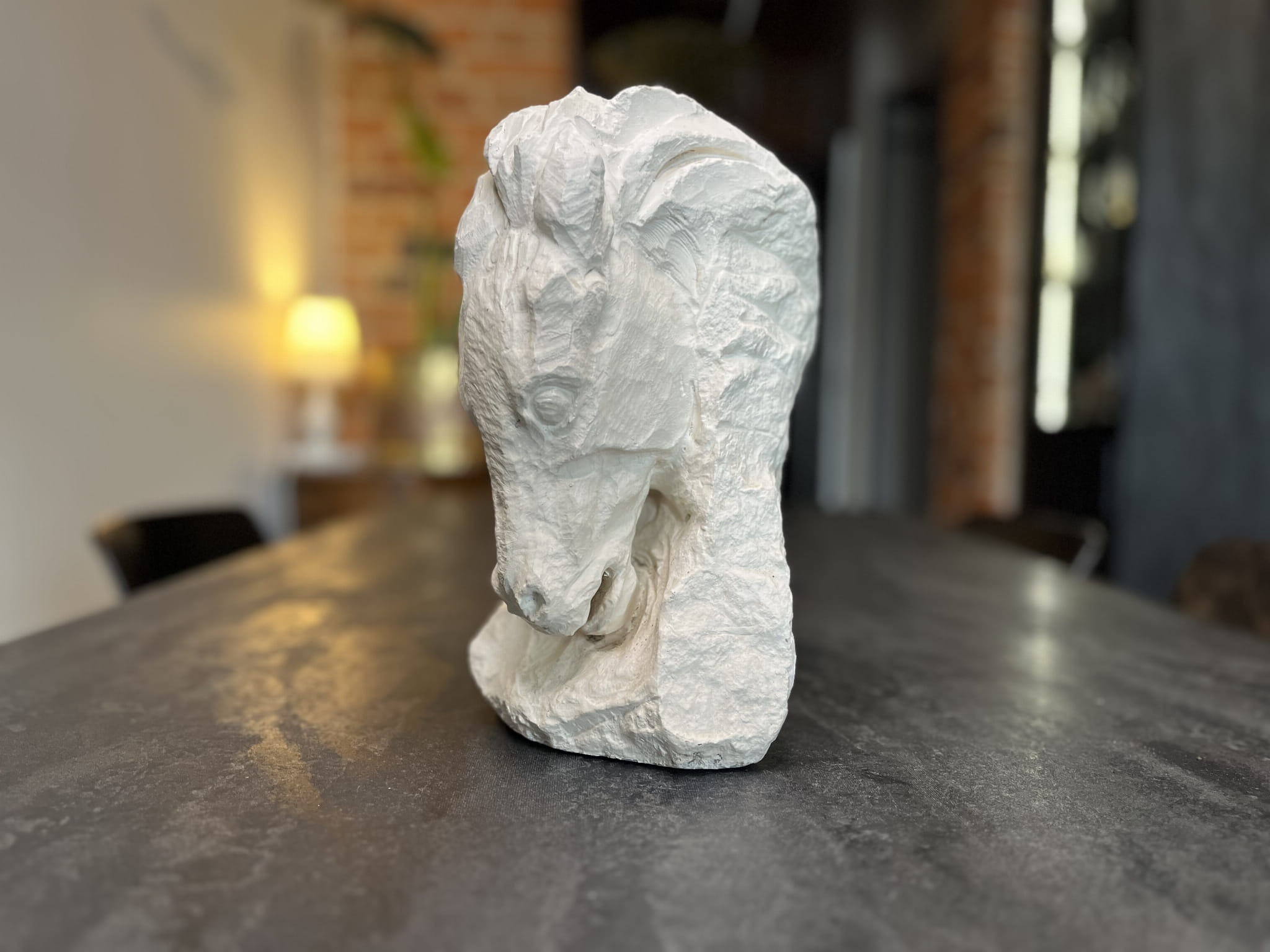 Efektowna rzeźba przedstawiająca głowę konia, utrzymana w klasycznej, realistycznej stylistyce. Wyraziste opracowanie detali – grzywy, pyska oraz linii głowy – nadaje jej szlachetny i dynamiczny charakter