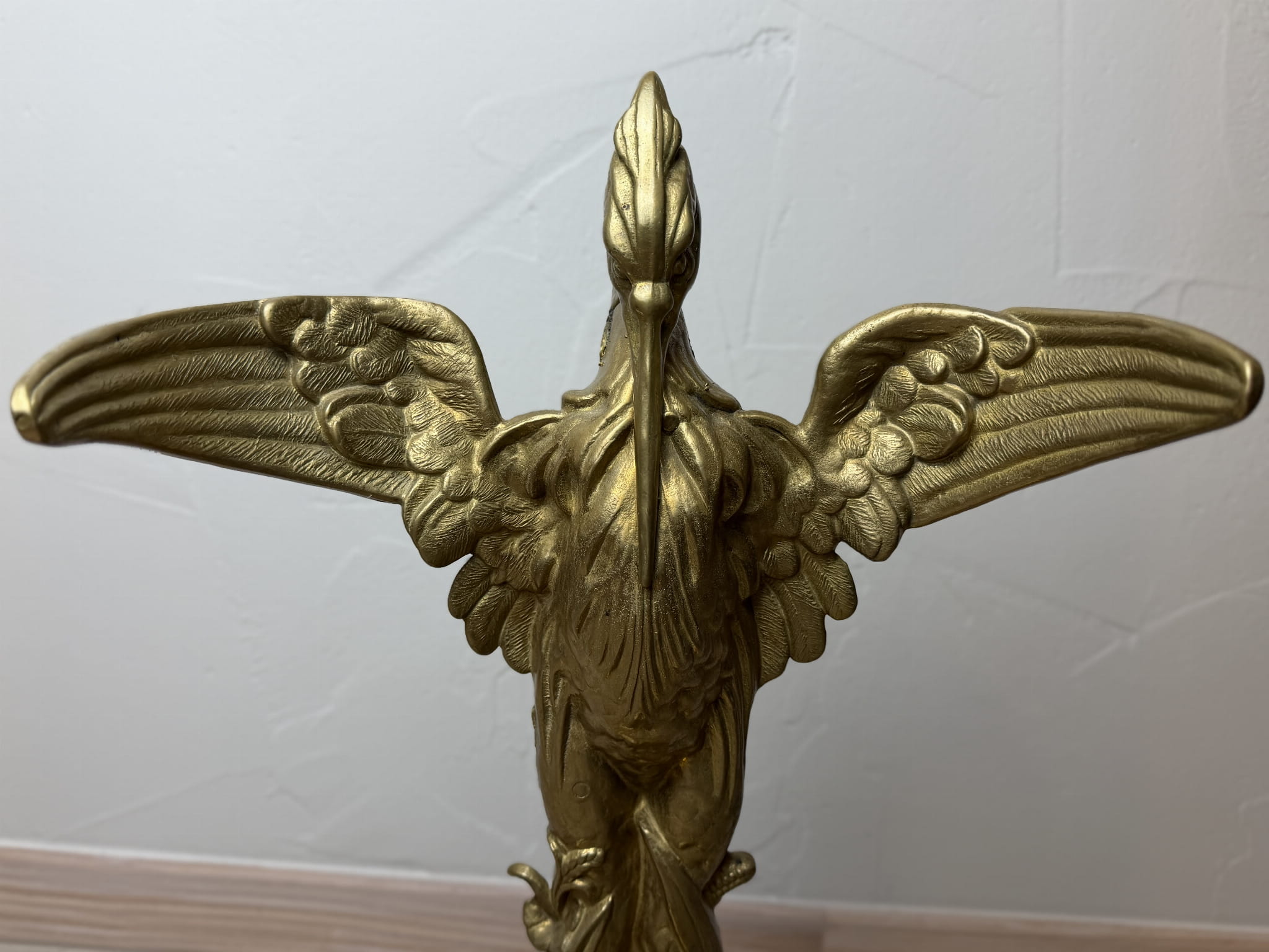 Efektowny stojak z brązu na parasole w stylu secesyjnym (Art Nouveau), uformowany w postaci dostojnej czapli z rozpostartymi skrzydłami. Bogato rzeźbiona forma, organiczne linie oraz motywy roślinne u podstawy doskonale oddają charakter przełomu XIX i XX wieku.