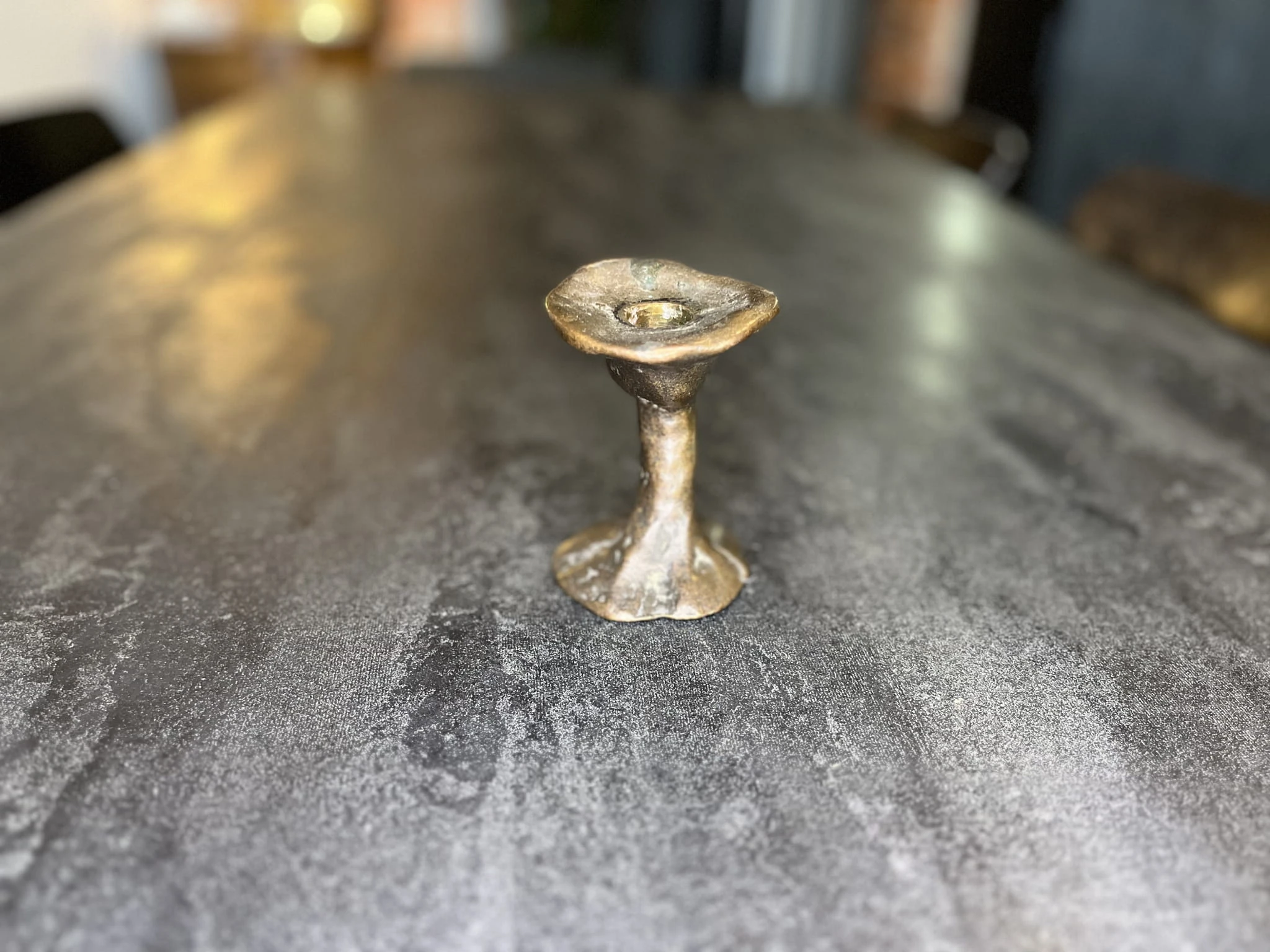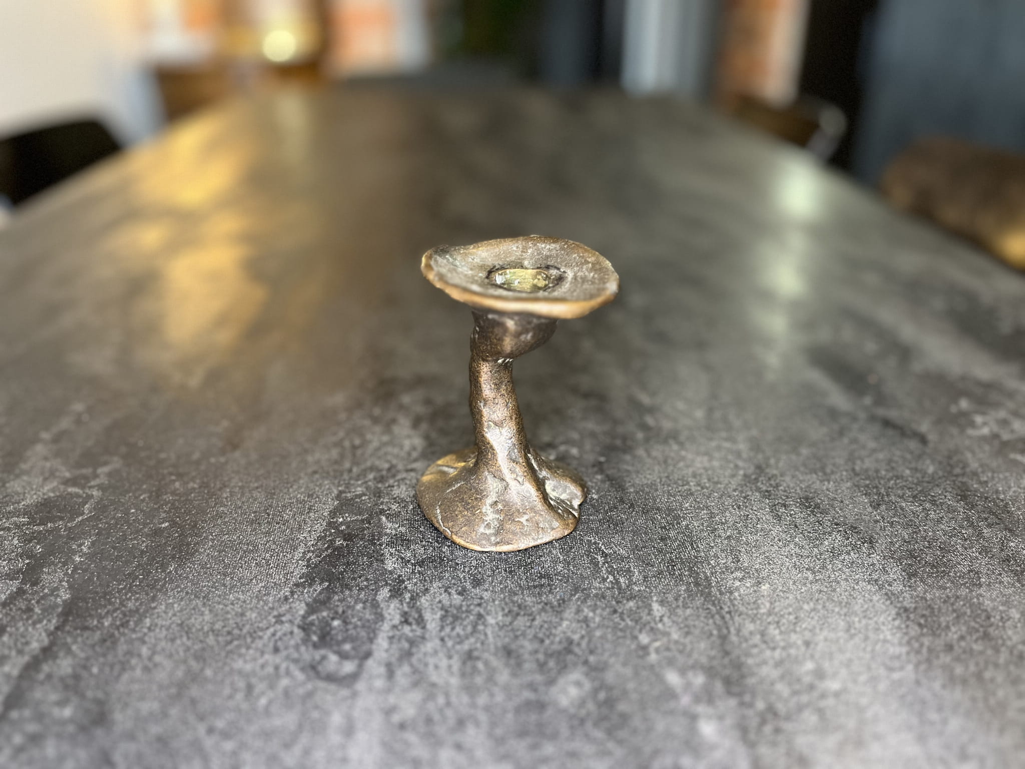 Niewielki świecznik wykonany z brązu i cyny, o organicznej, lekko nieregularnej formie. Surowa estetyka i ręcznie modelowany charakter nadają mu unikatowy, rzeźbiarski wyraz.
