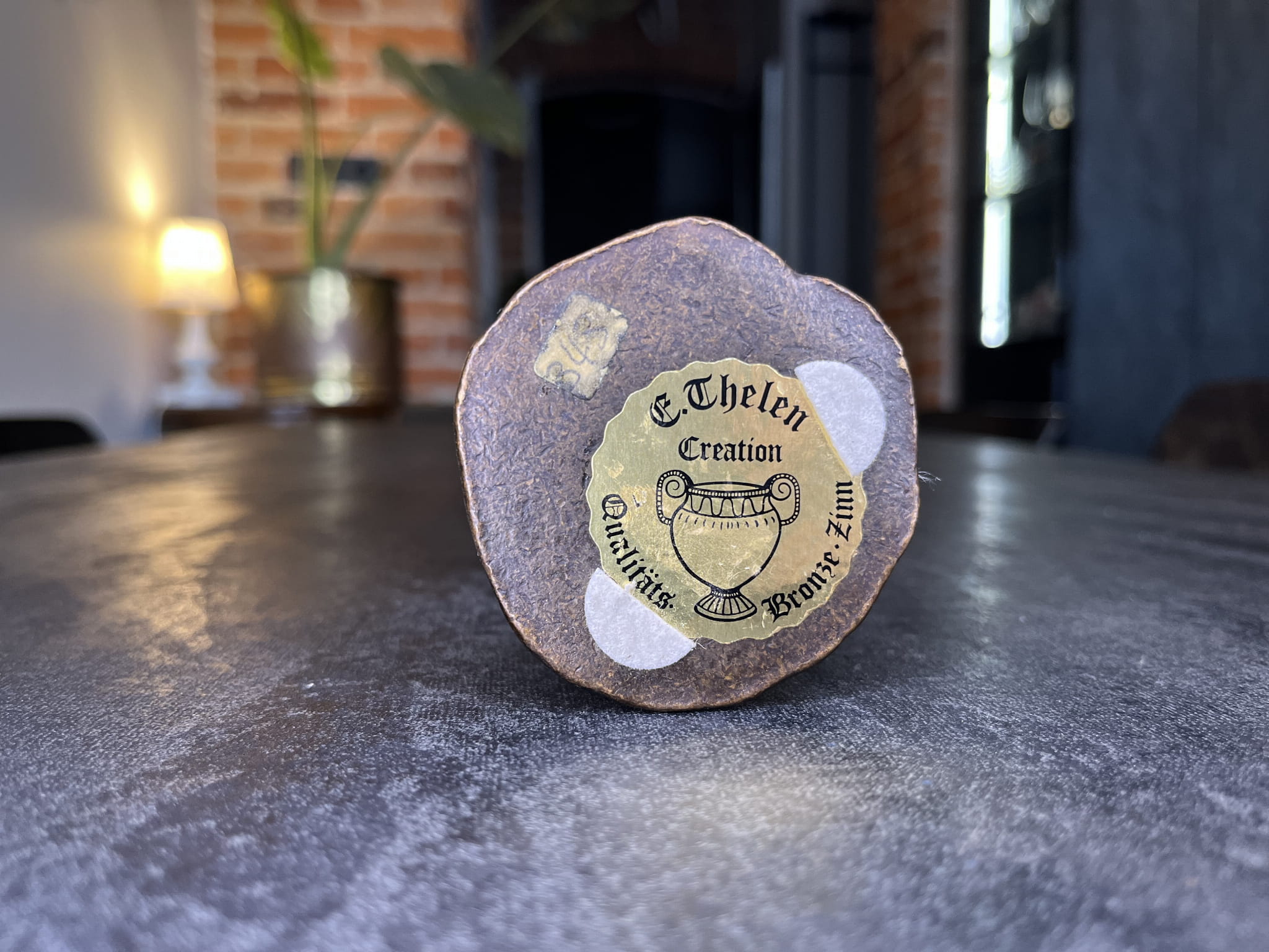 Na spodzie zachowana oryginalna sygnatura „E. Thelen Creation” z oznaczeniem Qualitäts Bronze Zinn, potwierdzająca wykonanie z brązu i cyny.