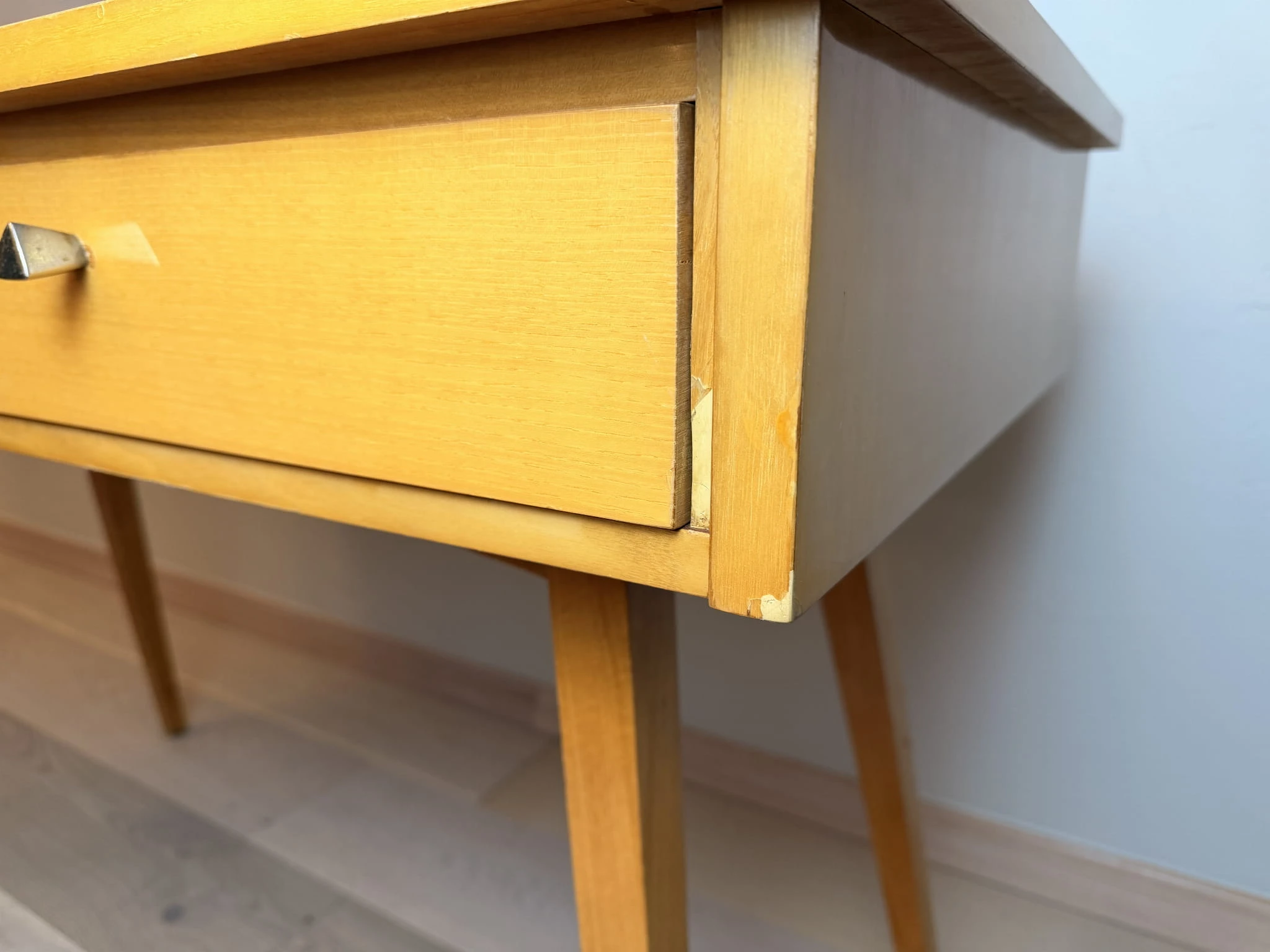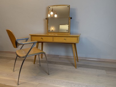 Elegancka toaletka z lustrem utrzymana w stylistyce modernizmu. Prosta, lekka forma oraz subtelne detale sprawiają, że mebel doskonale wpisuje się zarówno w wnętrza vintage, jak i współczesne aranżacje.