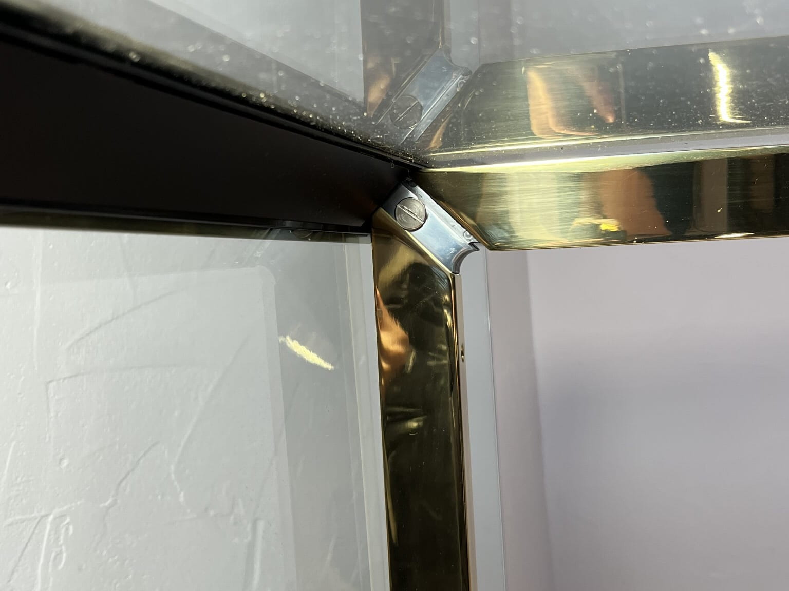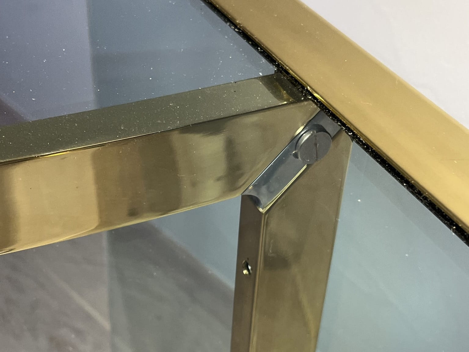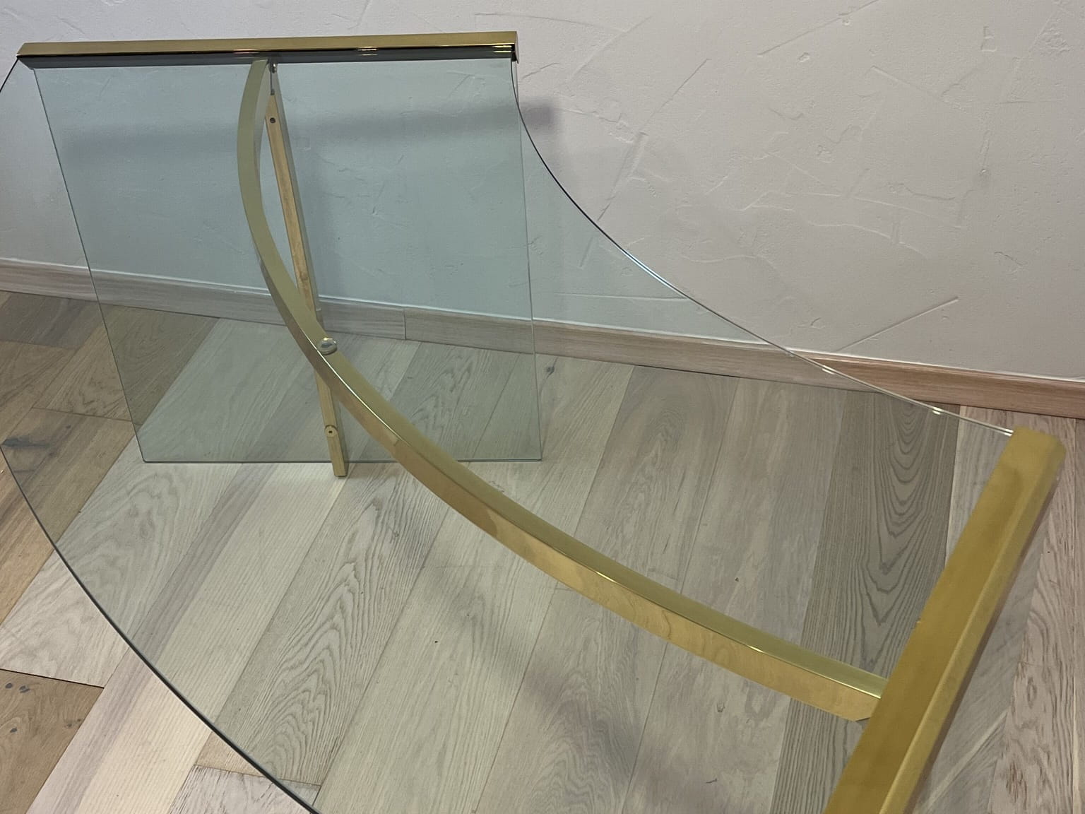 Blat wykonany z giętego, hartowanego szkła nadaje meblowi lekkości i dynamiki, jednocześnie zachowując wysoką trwałość użytkową. Konstrukcję wspierają pionowe tafle szkła oraz mosiężne elementy konstrukcyjne, które pełnią funkcję stabilizującą i dekoracyjną, podkreślając luksusowy charakter projektu.