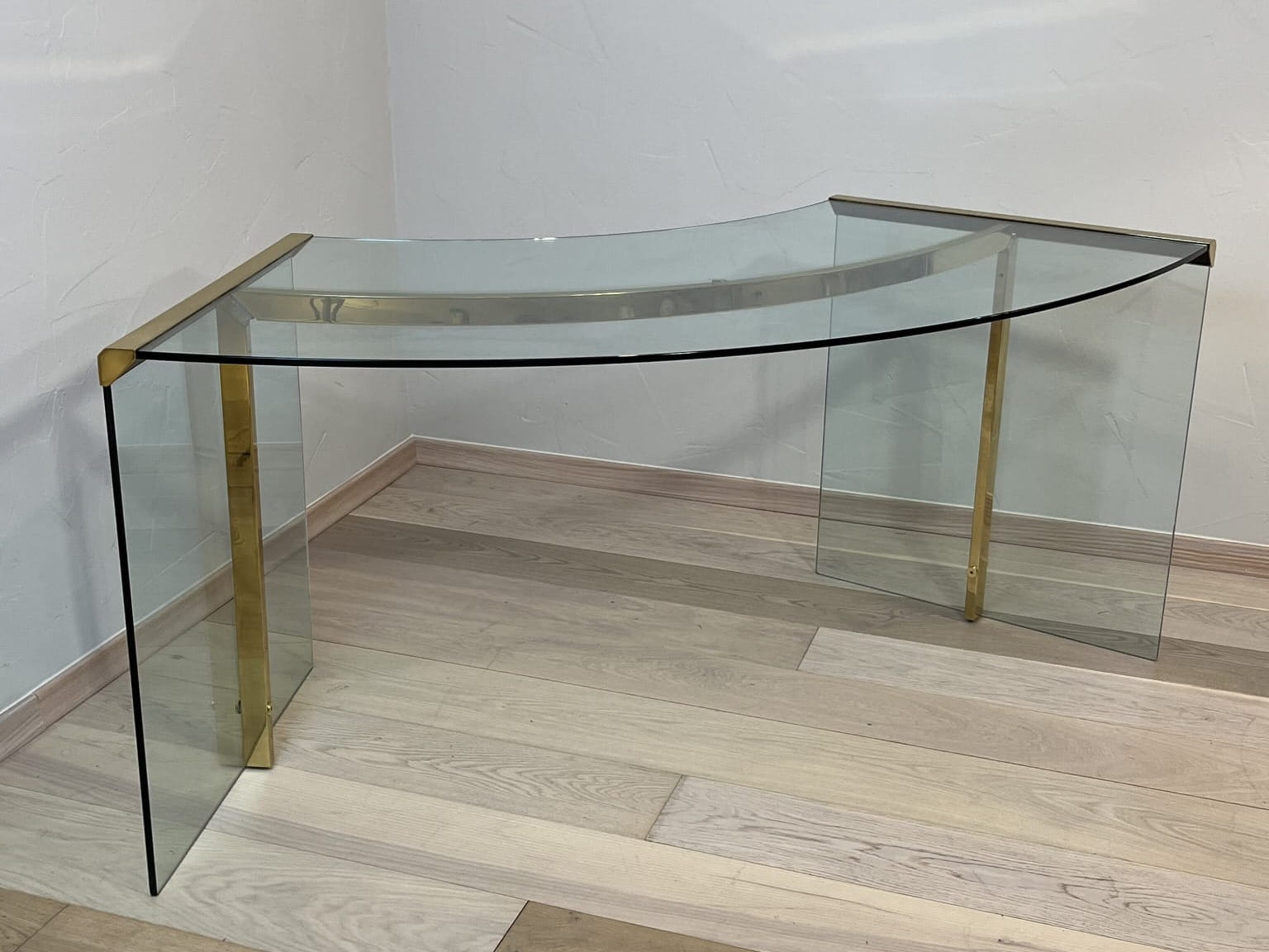 Eleganckie biurko ze szkła projektu Gallotti & Radice, ikony włoskiego wzornictwa specjalizującej się w luksusowych meblach szklanych. Ten wyjątkowy model łączy rzeźbiarską, lekko wygiętą formę blatu z minimalistyczną konstrukcją, tworząc wyrafinowany przykład włoskiego modernizmu z końca XX wieku.
